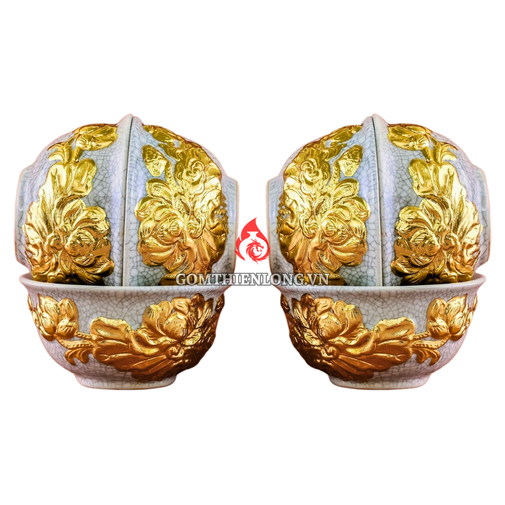Bộ Bát Thờ Cúng Bát Tràng Men Rạn Đắp Nổi Dát Vàng Hoa Sen 231163