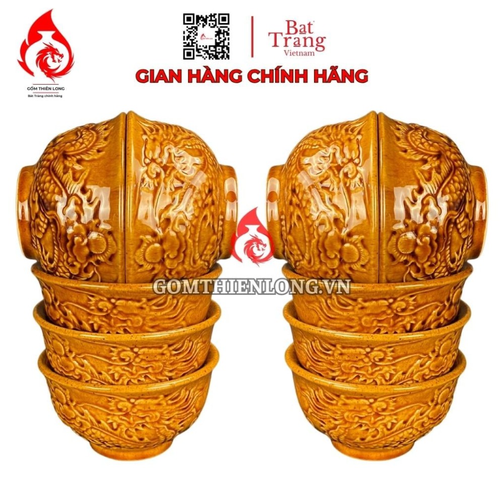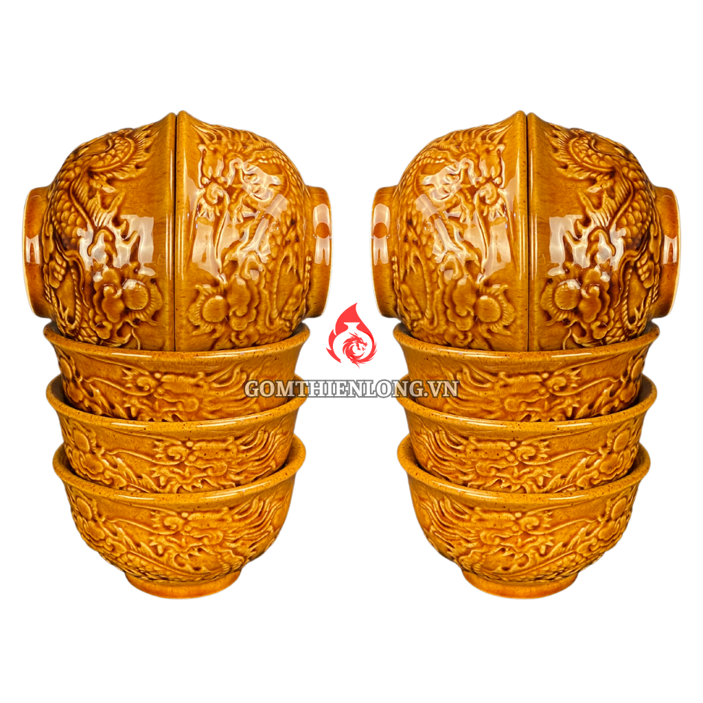 Bộ bát cúng Bát Tràng men vàng hoàng thổ đắp nổi long chầu nguyệt được sử dụng để cúng lễ, thờ cúng tổ tiên, thần linh. Bộ bát đĩa này mang ý nghĩa tâm linh sâu sắc, thể hiện tấm lòng thành kính của con cháu đối với tổ tiên, thần linh.