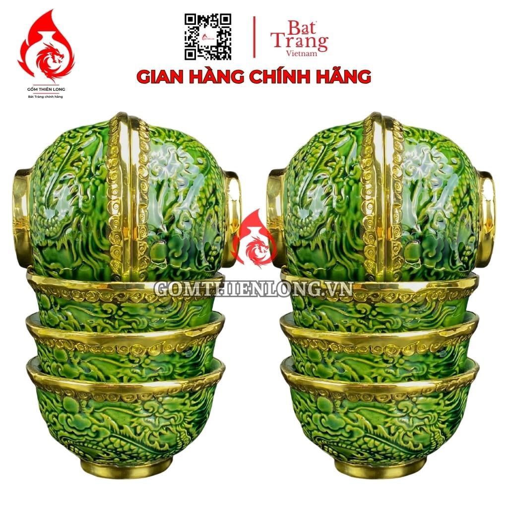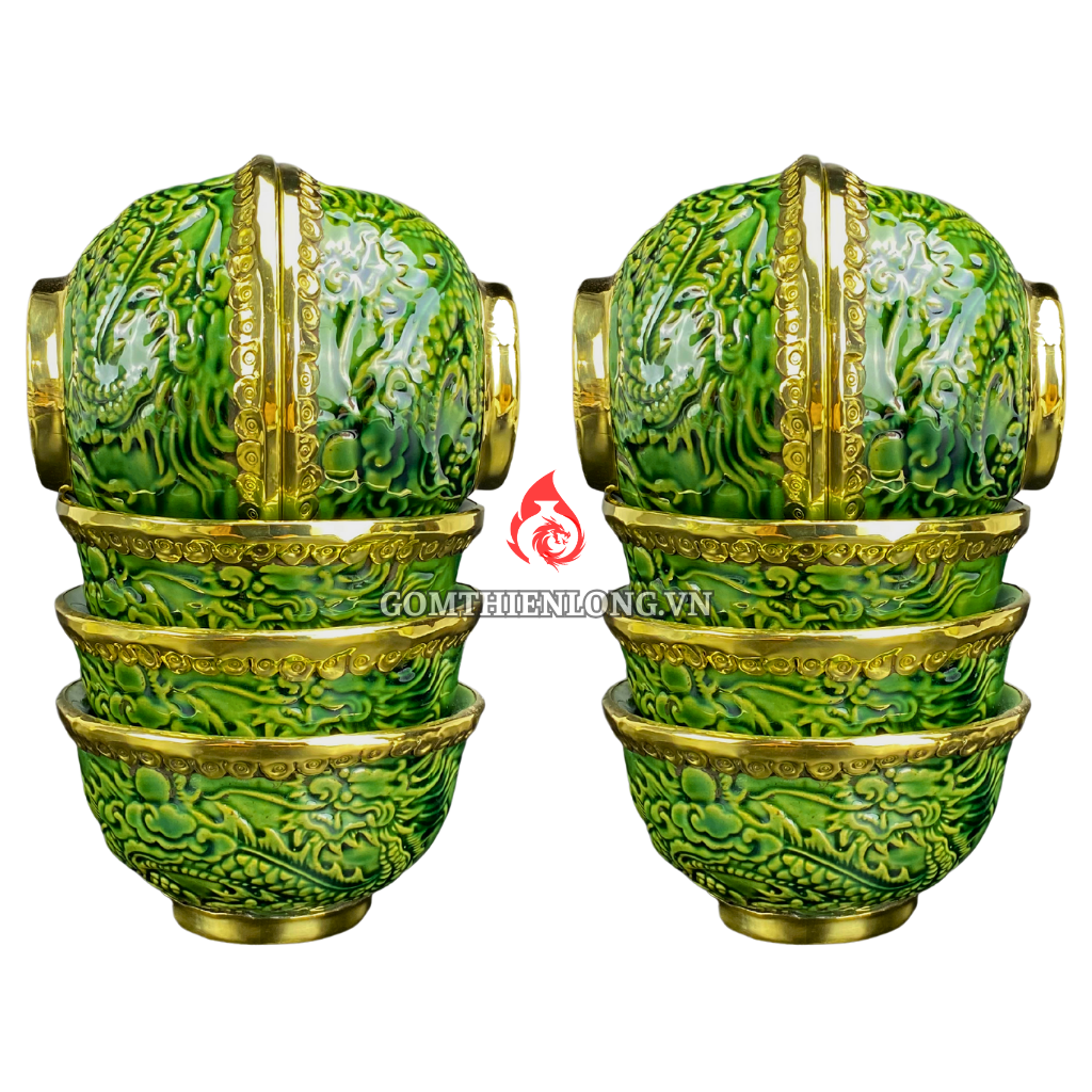 Bộ bát cúng Bát Tràng xanh ngọc lục bảo đắp nổi long chầu nguyệt được sử dụng để cúng lễ, thờ cúng tổ tiên, thần linh. Bộ bát đĩa này mang ý nghĩa tâm linh sâu sắc, thể hiện tấm lòng thành kính của con cháu đối với tổ tiên, thần linh.