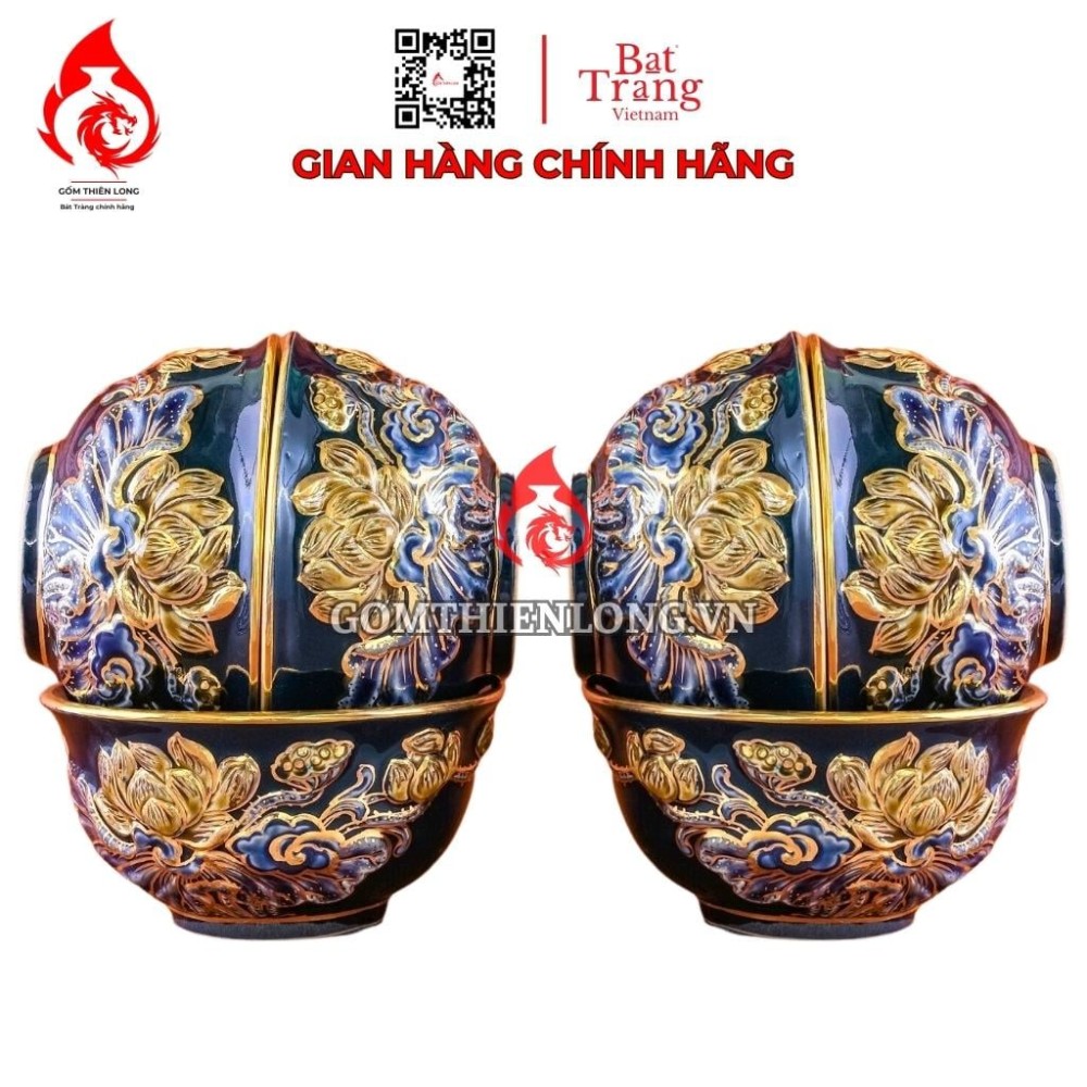 Thông tin sản phẩm Bộ Bát Cơm Thờ Cúng Bát Tràng Men Xanh Tím Đắp Nổi Vẽ Vàng Hoa Sen 231164