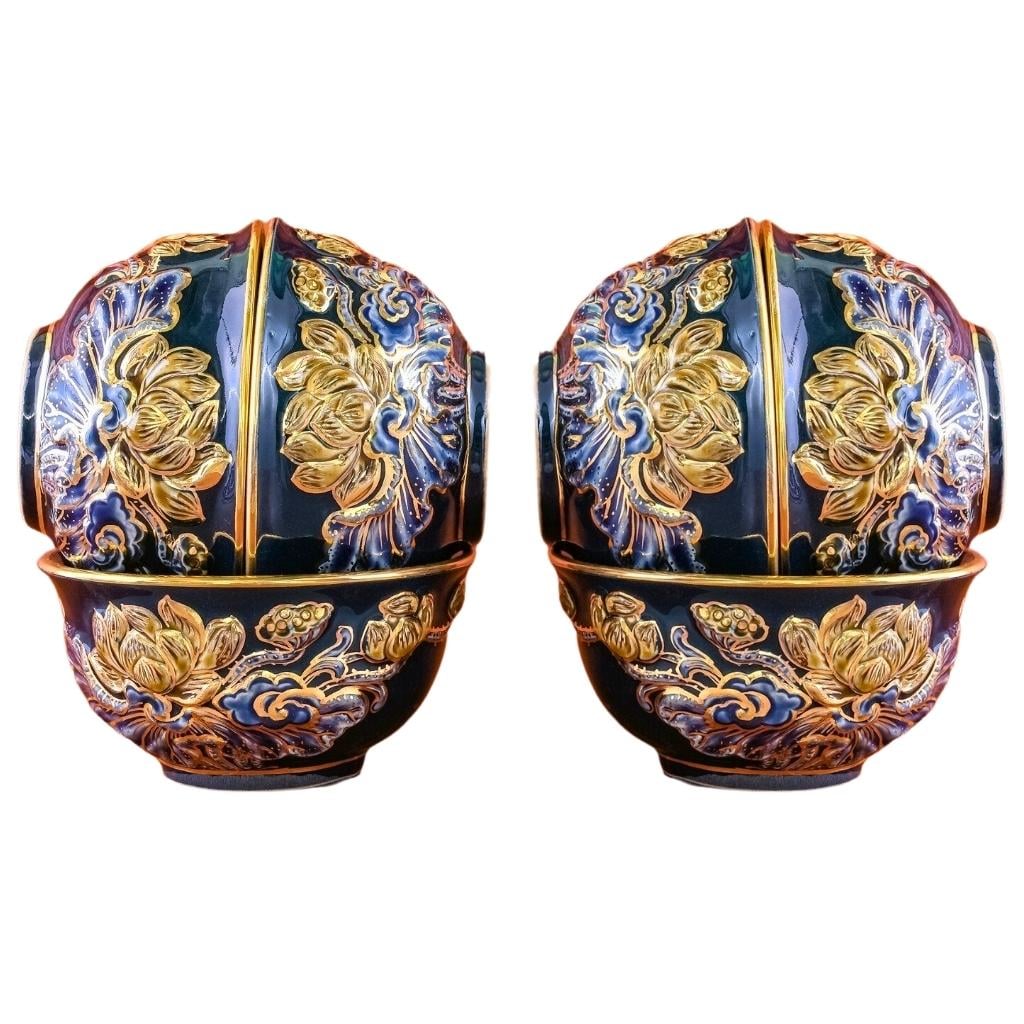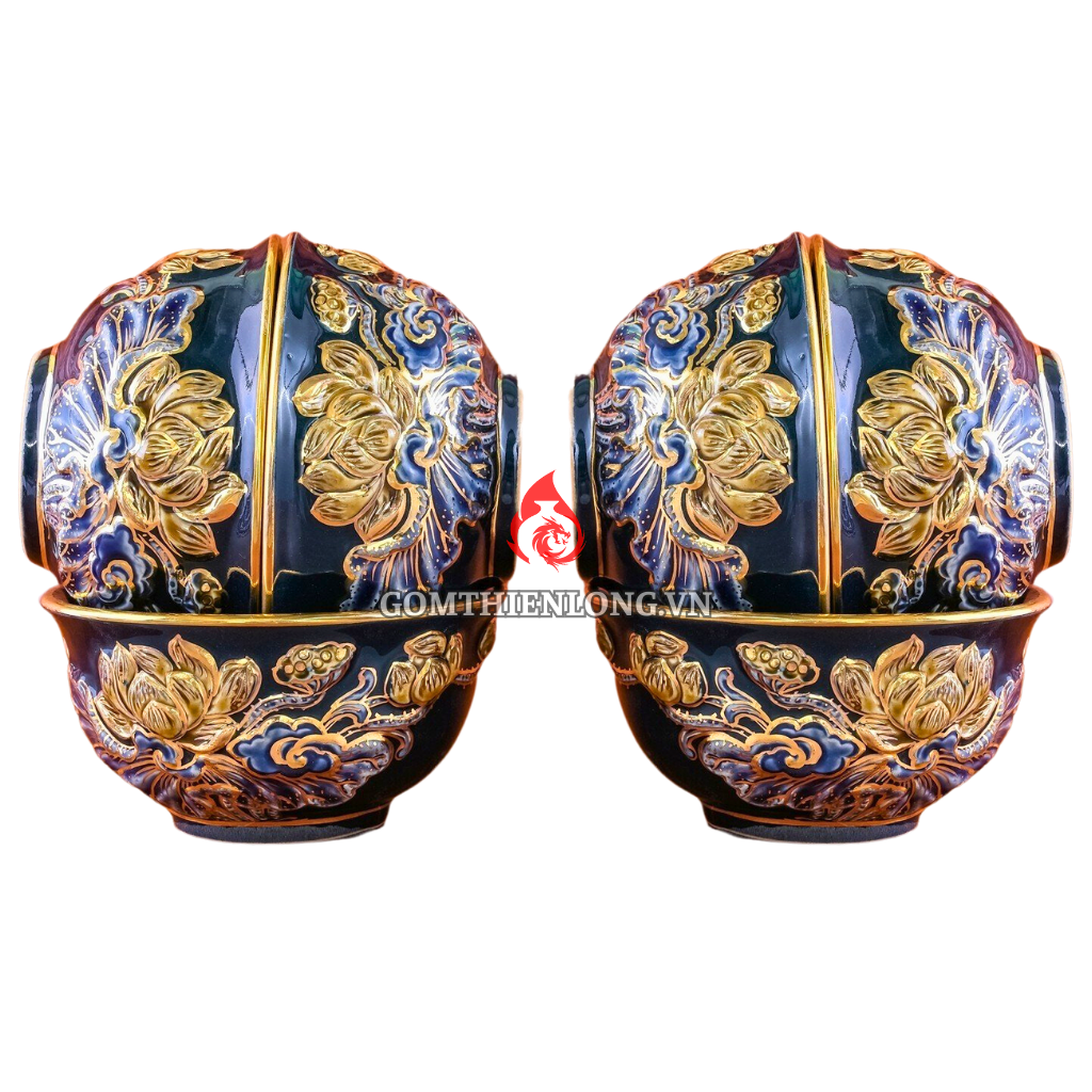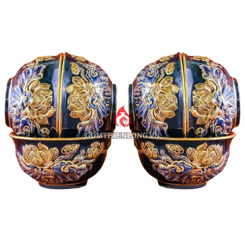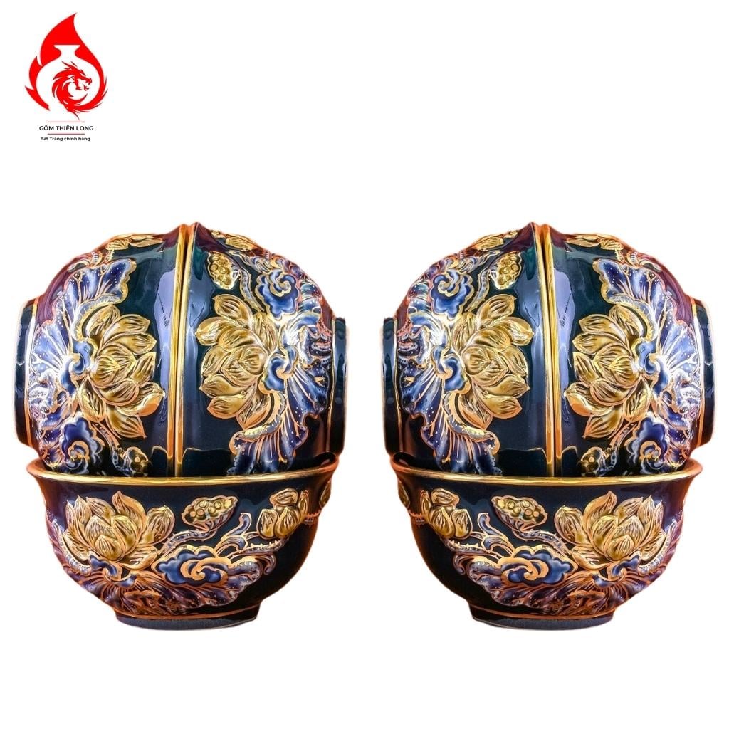 Bộ Bát Thờ Cúng Bát Tràng Men Xanh Tím Đắp Nổi Vẽ Vàng Hoa Sen 231164