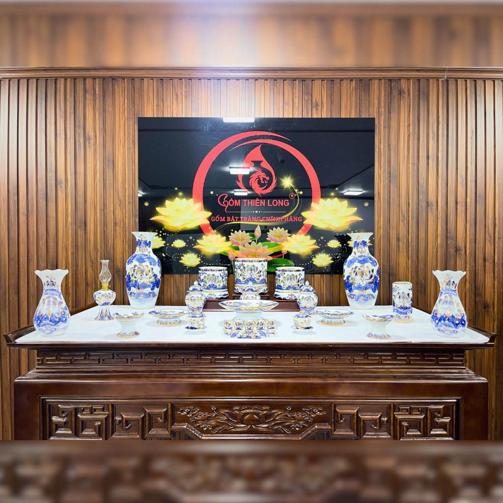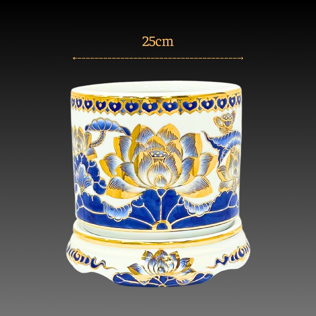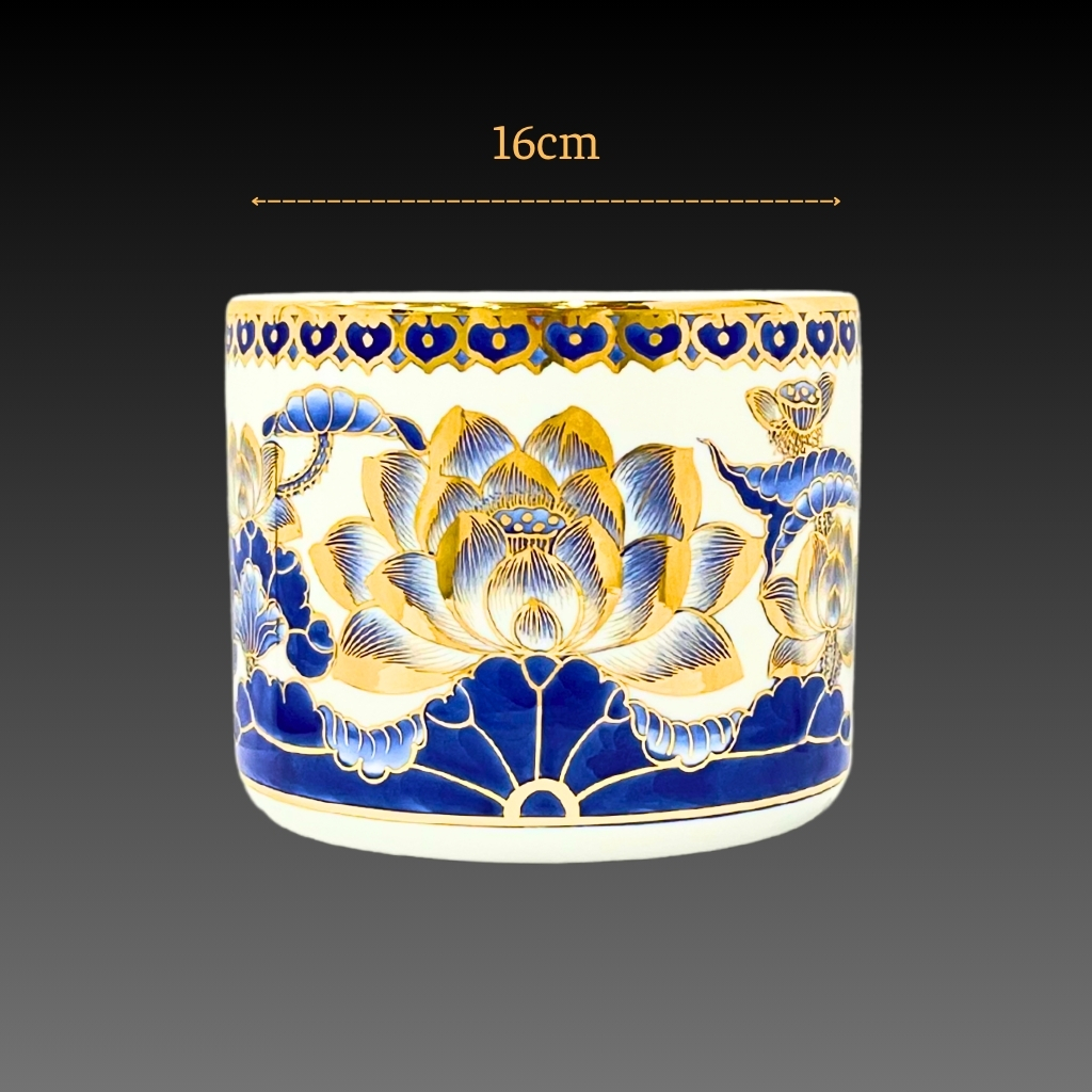 Bộ bát hương vẽ vàng 24k là một trong những sản phẩm gốm sứ cao cấp, được nhiều người yêu thích bởi vẻ đẹp tinh tế và ý nghĩa sâu sắc. Sự kết hợp hài hòa giữa màu men lam trắng thanh lịch, họa tiết hoa sen tinh xảo và lớp vàng 24k sang trọng đã tạo nên một tác phẩm nghệ thuật độc đáo, mang đậm giá trị truyền thống.