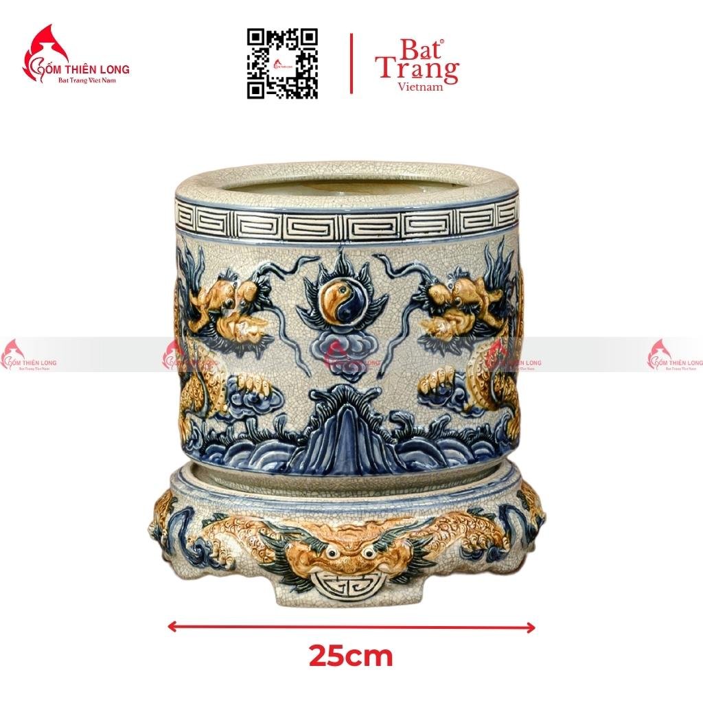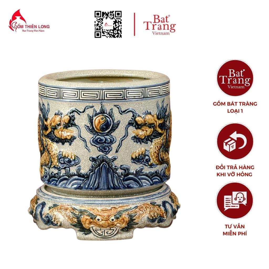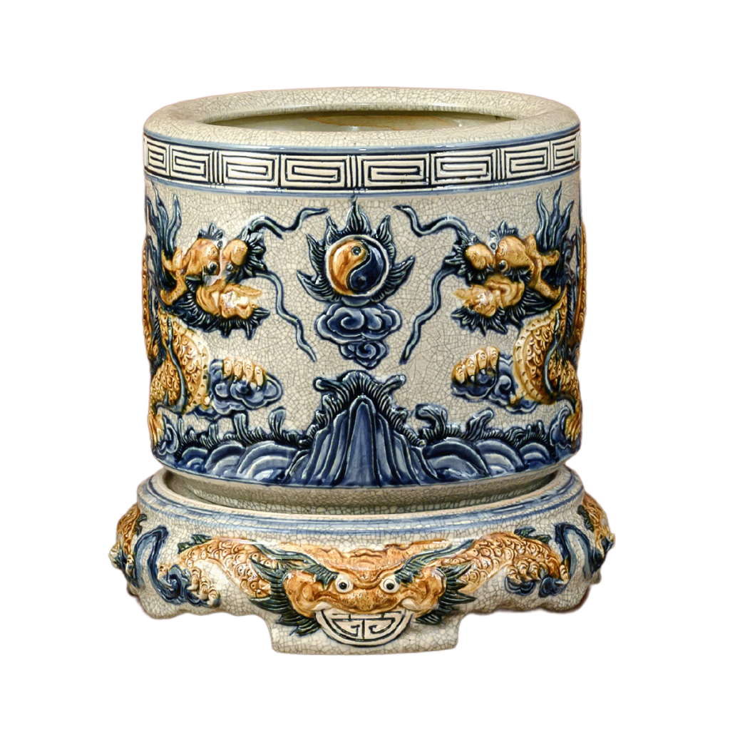 Họa tiết: Hoa văn trên bát hương được đắp nổi lưỡng long chầu mặt nguyệt và vân mây.