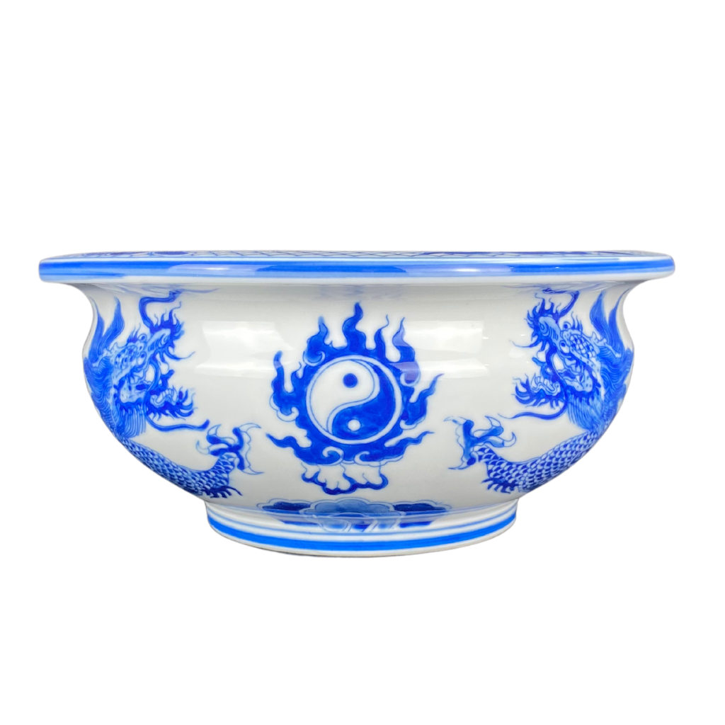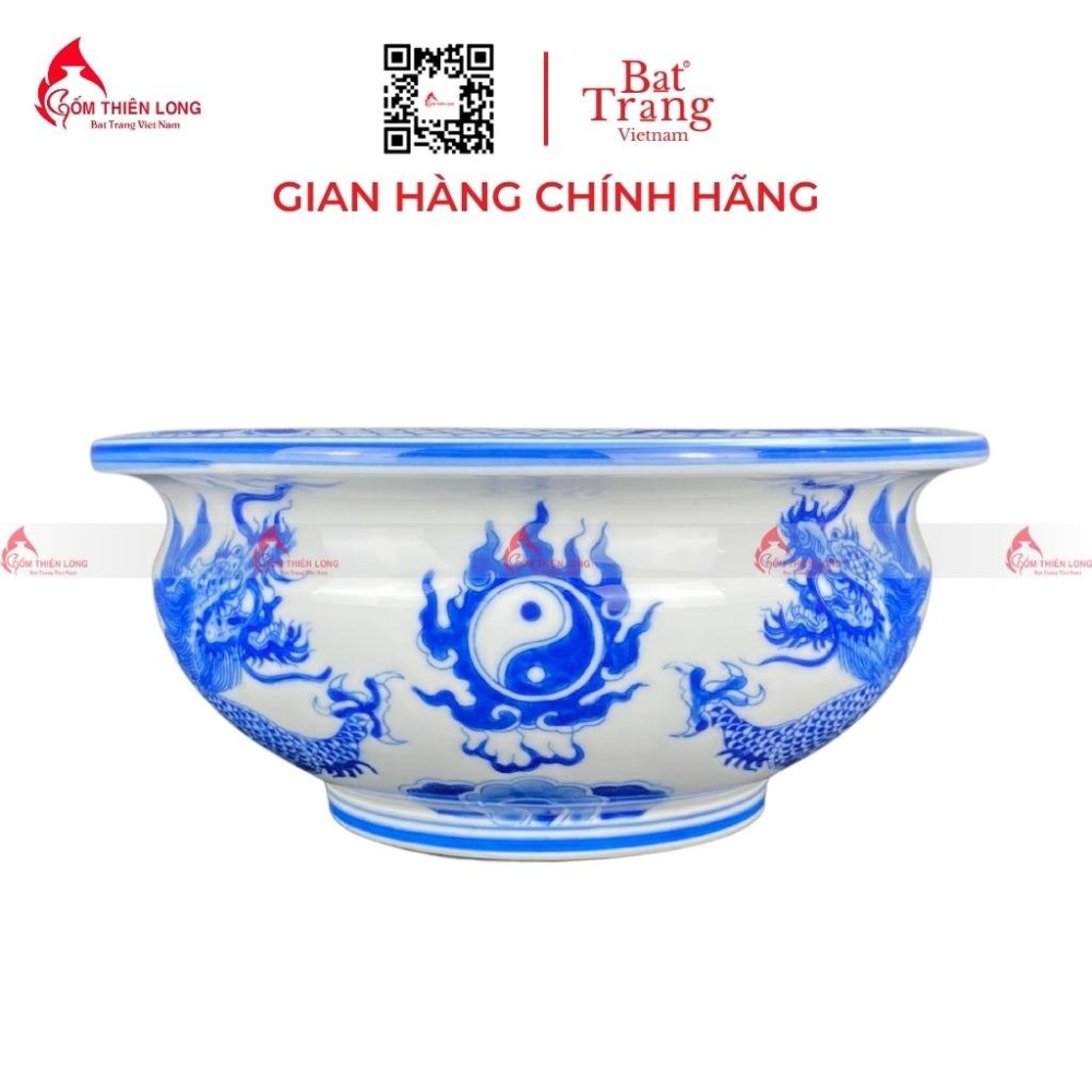 Ngoài thiết kế ấn tượng thì hoa văn và hoạt tiết của bát hương quả lựu men lam 160723 cũng vô cùng nổi bật. Họa tiết hoa văn lưỡng long chầu thái cực được vẽ bằng tay, hoàn toàn thủ công nên các nét vô cùng rõ và mềm mại trên bề mặt bát hương màu xanh lam cổ trên nền men dong.