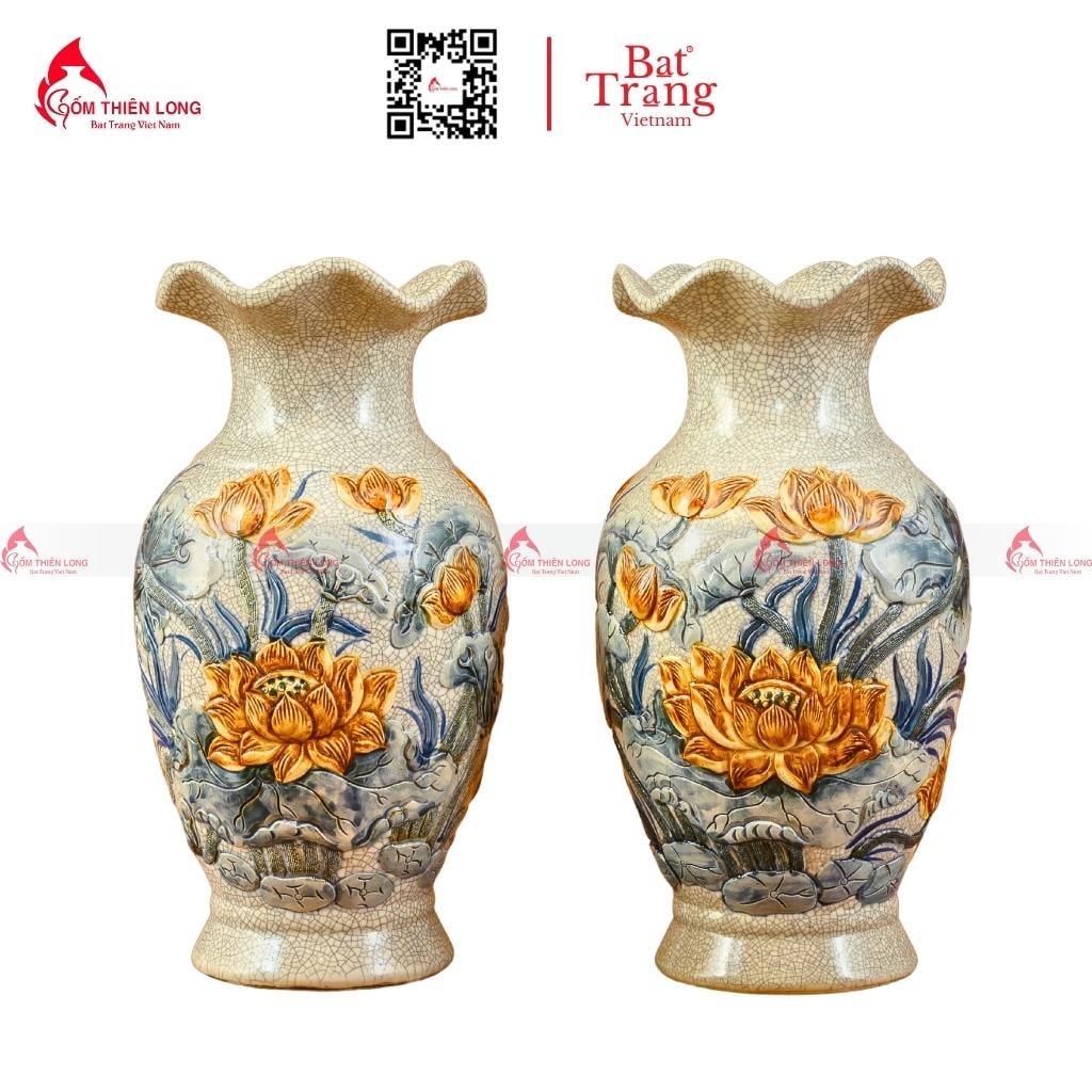Bình hoa men rạn đắp nổi hoa sen cầu kỳ: Bình hoa có hoa văn hoa sen cầu kỳ, tinh xảo, mang ý nghĩa cao quý và sang trọng.