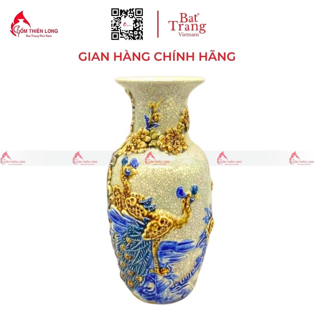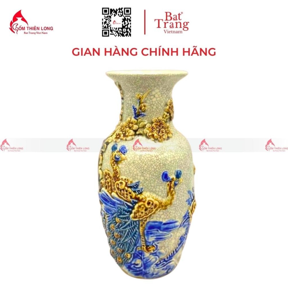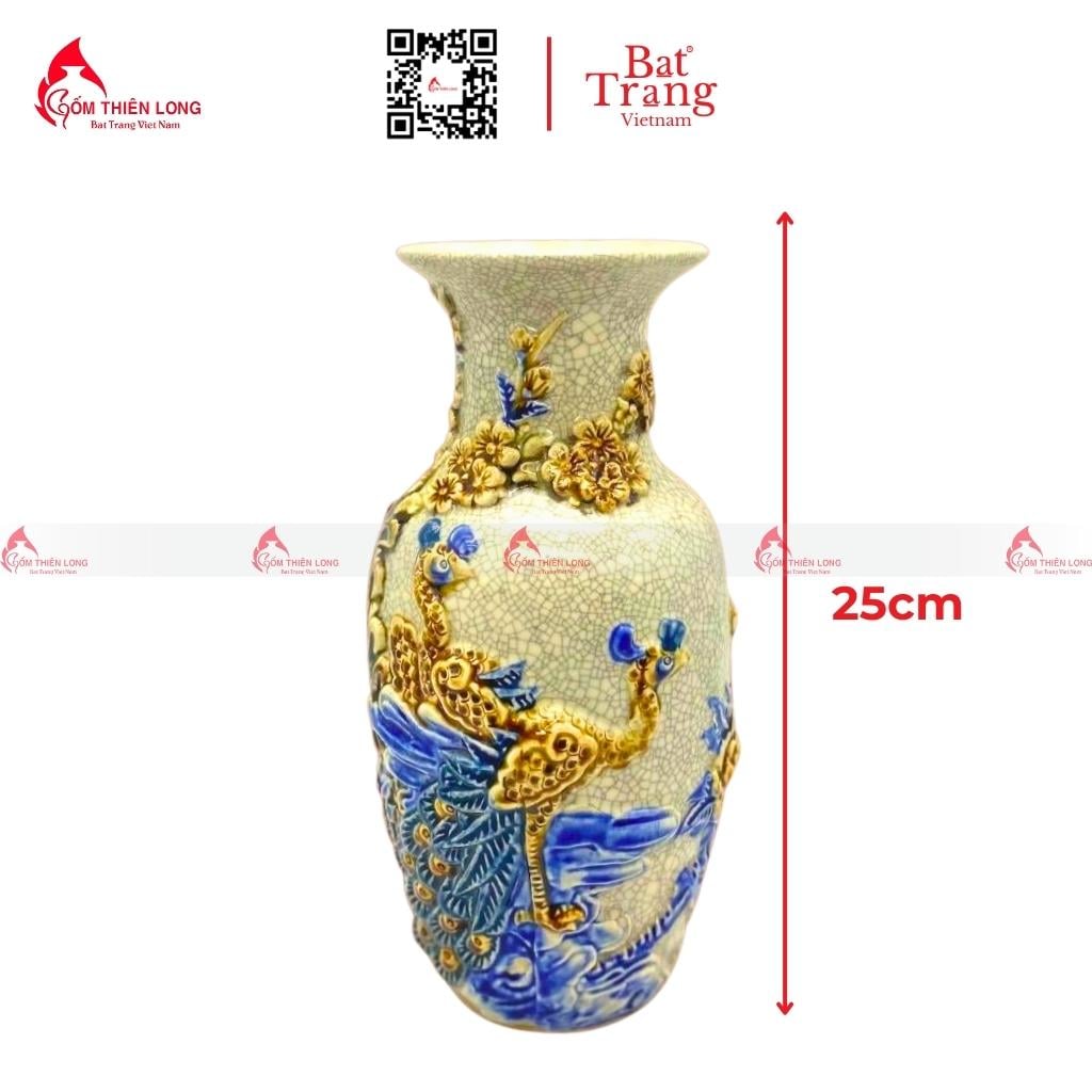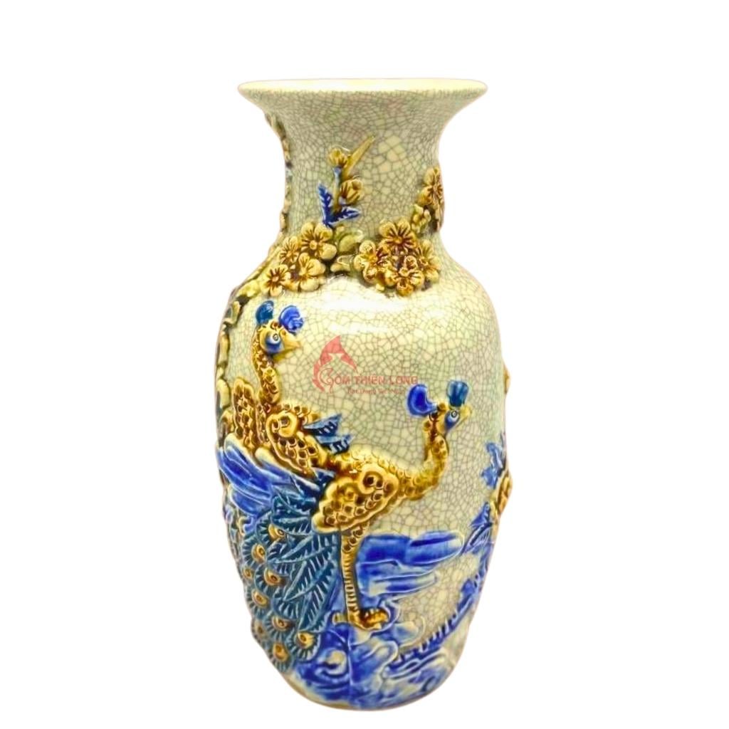 Bình hoa bàn thờ men rạn đắp nổi công đào là một sản phẩm thủ công mỹ nghệ tinh xảo, được làm từ chất liệu gốm sứ cao cấp. Bình hoa có thiết kế độc đáo, với màu men rạn tinh tế, kết hợp với hình ảnh chim công và hoa đào, mang ý nghĩa phong thủy tốt đẹp. Bình hoa rất thích hợp để trưng bày trên bàn thờ, vừa tôn lên vẻ đẹp trang nghiêm của không gian thờ cúng, vừa mang đến may mắn và bình an cho gia đình.
