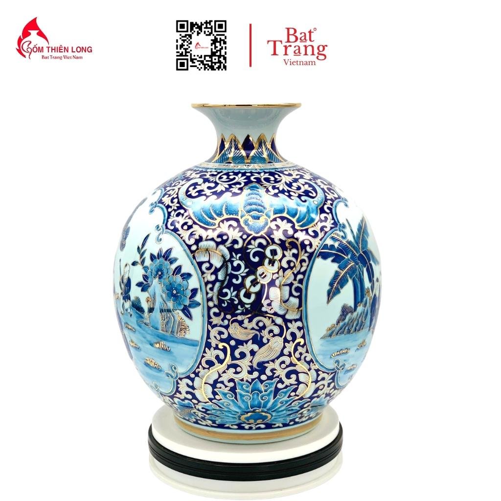 Nhằm giúp các họa tiết trở nên có hồn hơn, những nghệ nhân Bát Tràng còn sử dụng kỹ thuật dùng vàng kim để vẽ nên chúng. Chất liệu vàng kim được thêm thắt một cách khéo léo, không những giúp tiểu cảnh trở nên sống động và đẹp hơn mà còn làm tăng giá trị, tính sang trọng cho bình gốm Bát Tràng này.