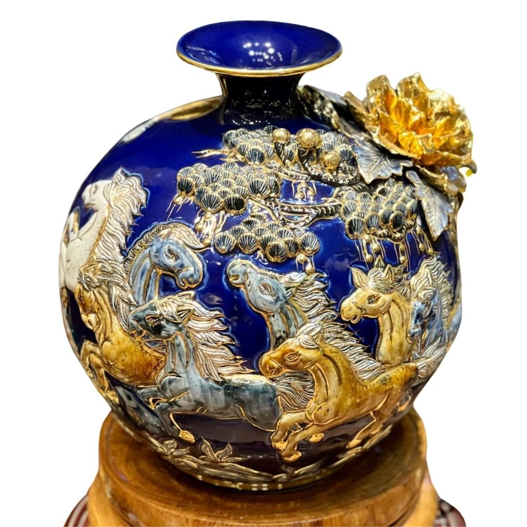 Bình hút lộc mã đáo thành công vẽ vàng đắp nổi màu xanh tím - sự tâm huyết của người nghệ nhân làng gốm Bát Tràng