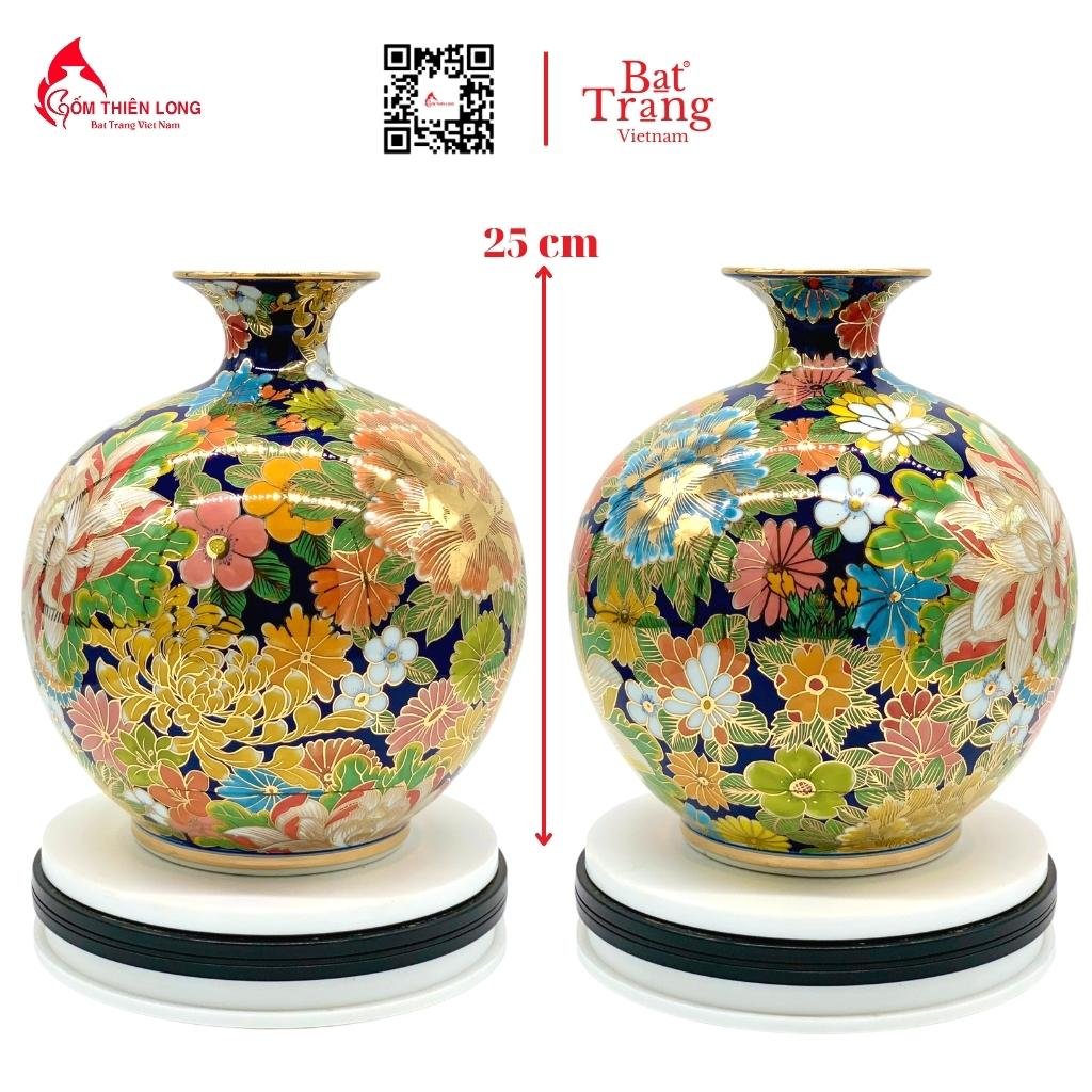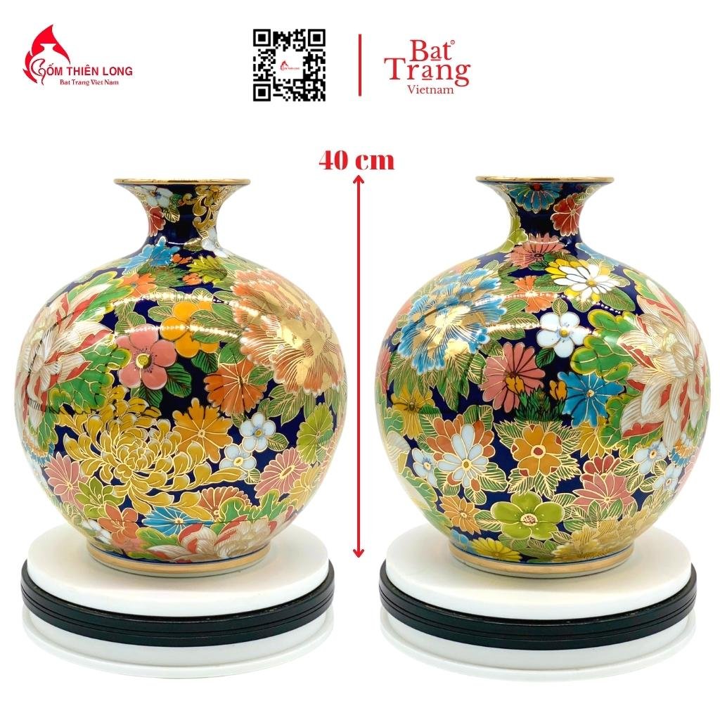 Điểm khác biệt có giá trị nhất của sản phẩm này bên cạnh chất liệu gốm sứ vẽ vàng chính là các hoa văn họa tiết được các nghệ nhân vẽ tay thủ công 100%. Với chủ đề là ngàn hoa khoe sắc, toàn bộ thân bình gốm được vẽ rất nhiều loài hoa khác nhau.