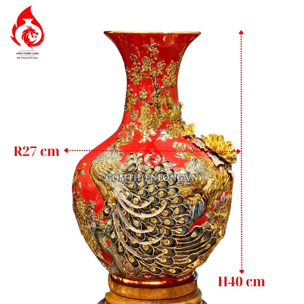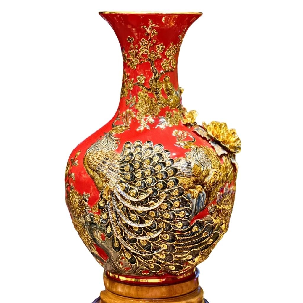 Họa tiết trên bình củ tỏi được người nghệ nhân đắp nổi bằng tay vô cùng tinh xảo, phải mất nhiều ngày mới có thể hoàn thiện được. Khi ngắm thành phẩm gia chủ có thể thấy được độ tỉ mỉ từng gân lá, cánh hoa hay đuôi chim công được đắp nổi mềm mại trên thân bình.