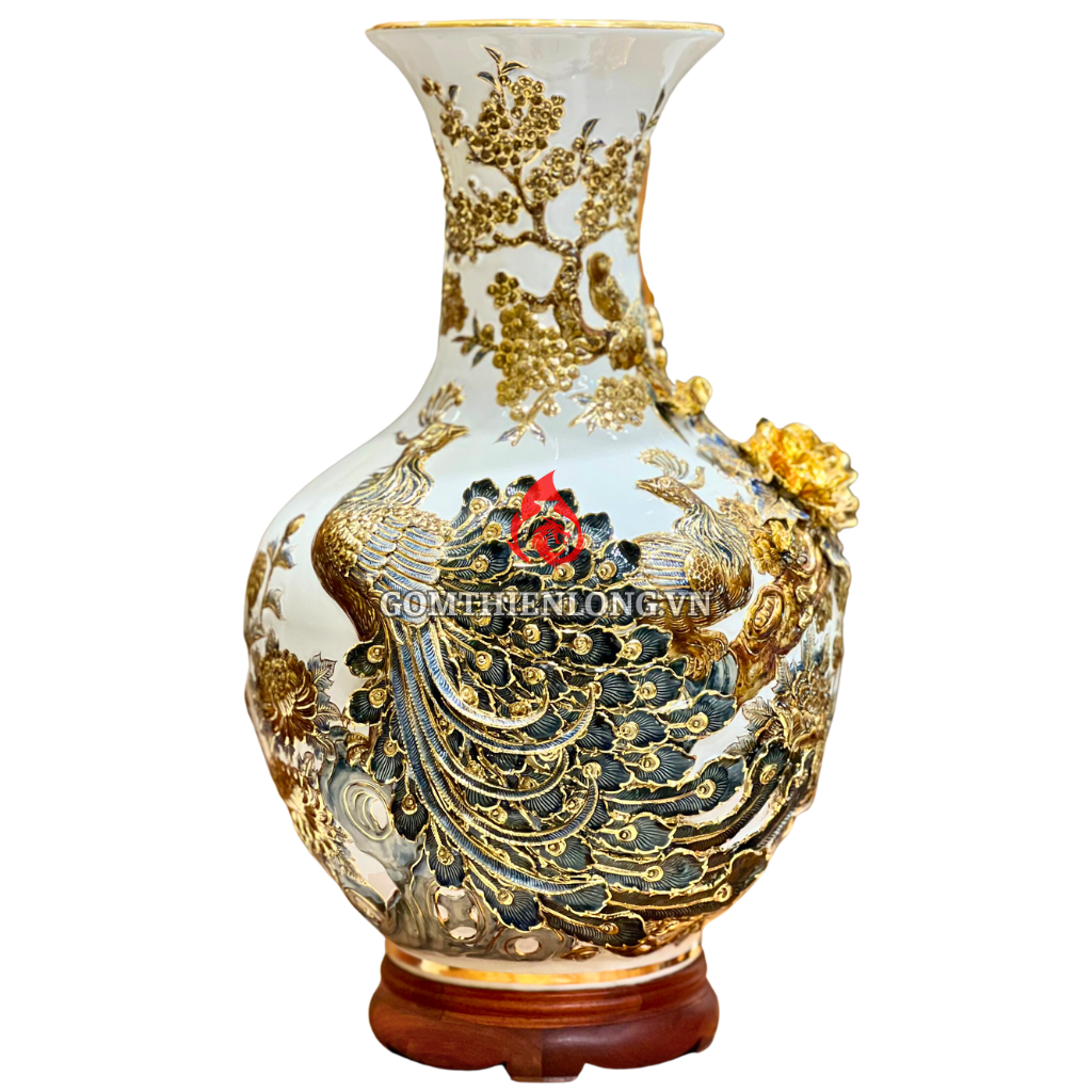 Họa tiết trên bình củ tỏi được người nghệ nhân đắp nổi bằng tay vô cùng tinh xảo, phải mất nhiều ngày mới có thể hoàn thiện được. Khi ngắm thành phẩm gia chủ có thể thấy được độ tỉ mỉ từng gân lá, cánh hoa hay đuôi chim công được đắp nổi mềm mại trên thân bình.