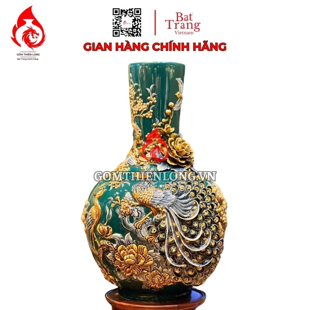 Họa tiết trên bình củ tỏi được người nghệ nhân đắp nổi bằng tay vô cùng tinh xảo, phải mất nhiều ngày mới có thể hoàn thiện được. Khi ngắm thành phẩm gia chủ có thể thấy được độ tỉ mỉ từng gân lá, cánh hoa hay đuôi chim công được đắp nổi mềm mại trên thân bình.
