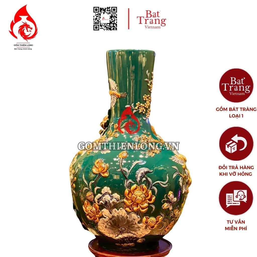 Bình củ tỏi Bát Tràng màu xanh lục bảo đắp nổi công hoa phú quý thường được đặt ở phòng khách, phòng làm việc hoặc phòng thờ để trang trí và mang lại may mắn, tài lộc cho gia chủ. Ngoài ra, bình củ tỏi còn có thể được sử dụng để cắm hoa, cắm hoa sen, cành đào ngày tết, trưng bày đồ lưu niệm,...