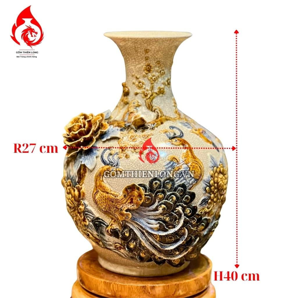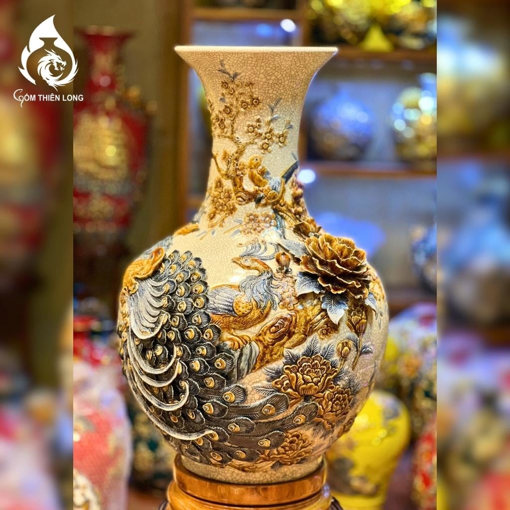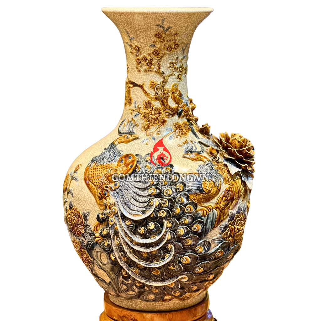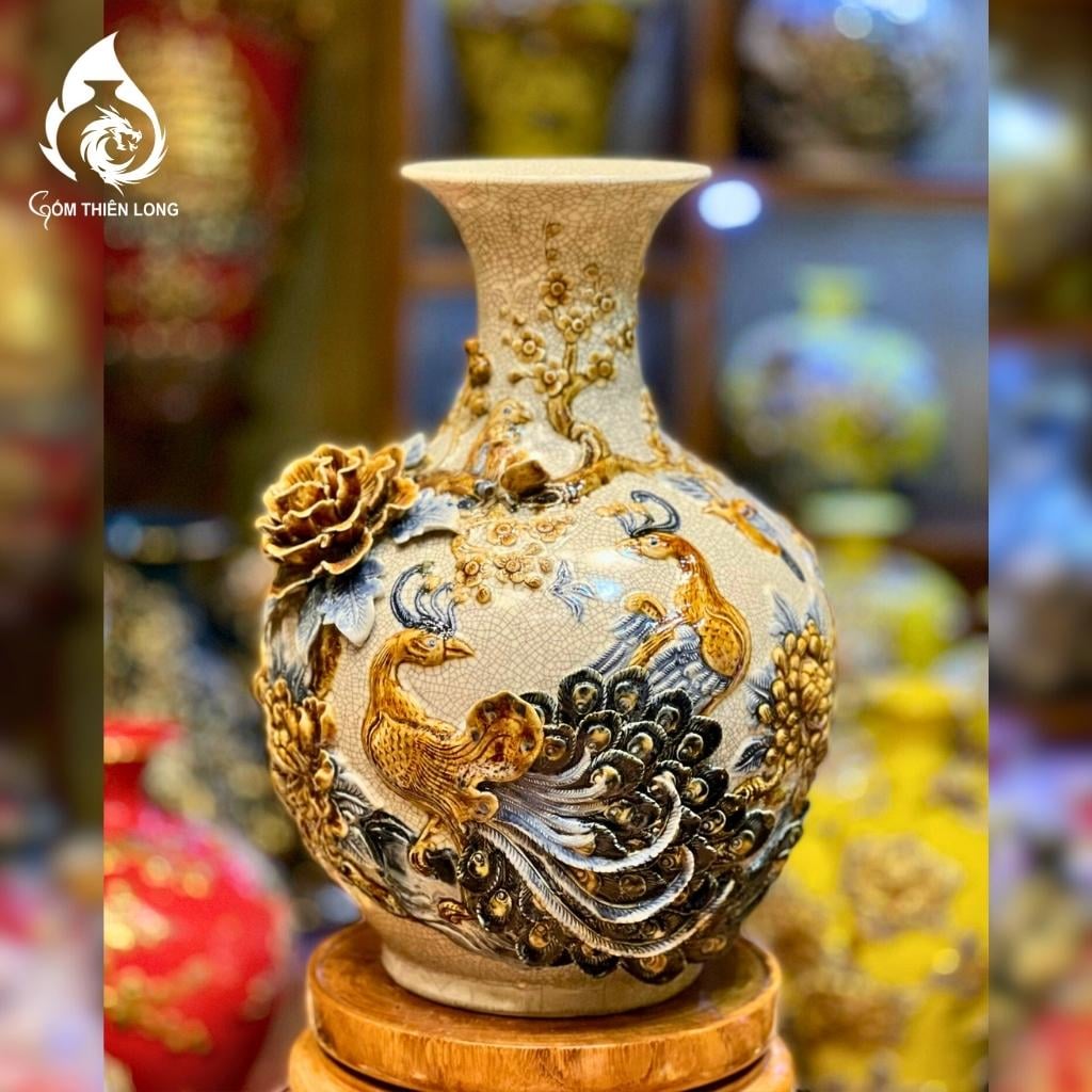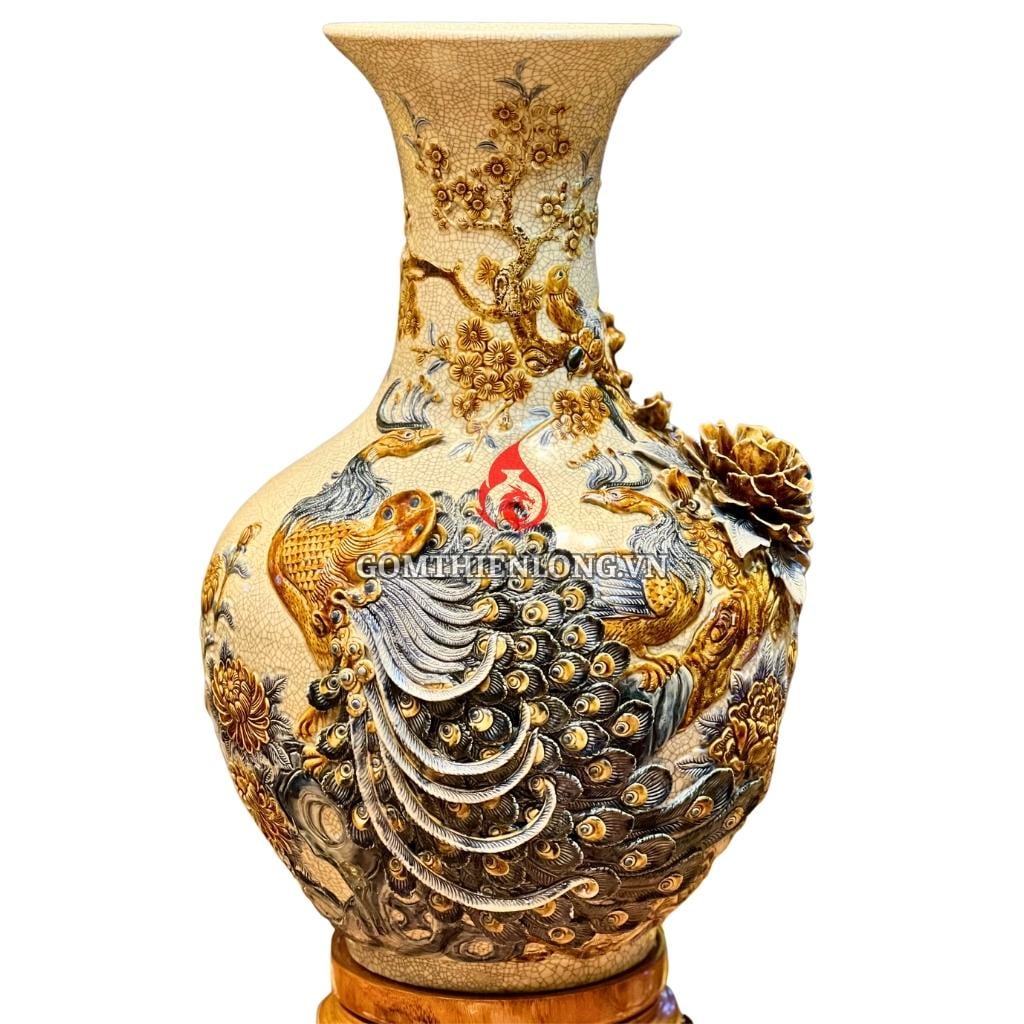 Họa tiết trên bình củ tỏi được người nghệ nhân đắp nổi bằng tay vô cùng tinh xảo, phải mất nhiều ngày mới có thể hoàn thiện được. Khi ngắm thành phẩm gia chủ có thể thấy được độ tỉ mỉ từng gân lá, cánh hoa hay đuôi chim công được đắp nổi mềm mại trên thân bình.