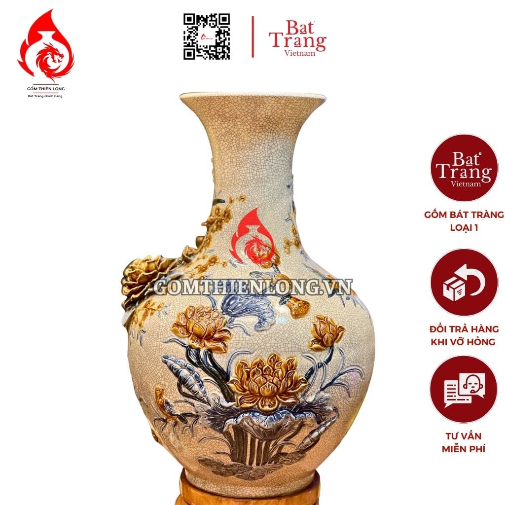 Bình củ tỏi Bát Tràng men rạn đắp nổi công hoa phú quý thường được đặt ở phòng khách, phòng làm việc hoặc phòng thờ để trang trí và mang lại may mắn, tài lộc cho gia chủ. Ngoài ra, bình củ tỏi còn có thể được sử dụng để cắm hoa, cắm hoa sen, cành đào ngày tết, trưng bày đồ lưu niệm,...