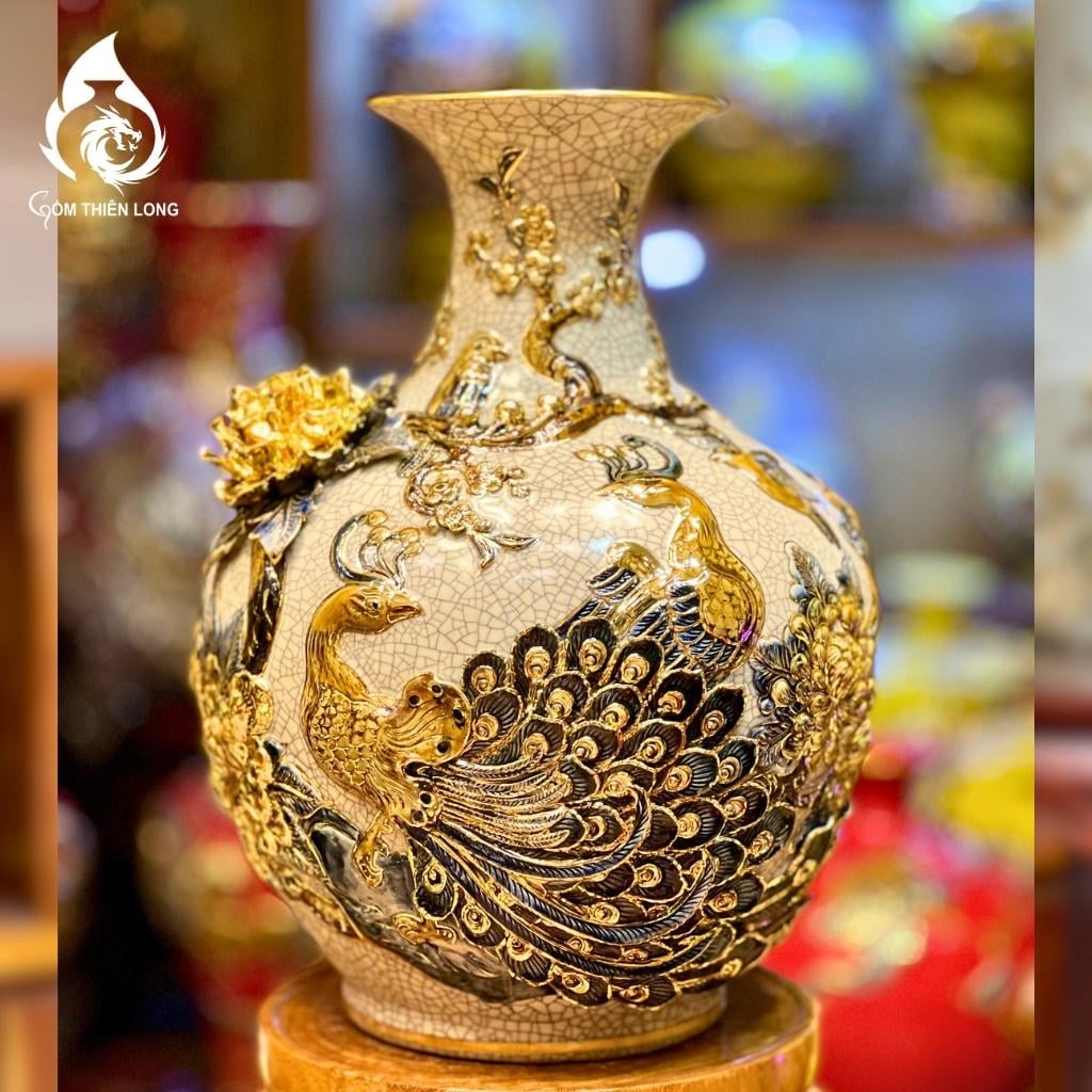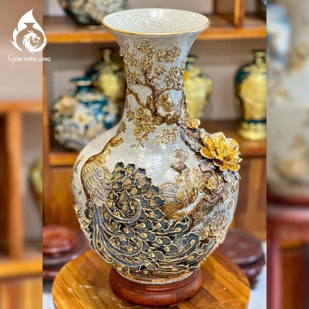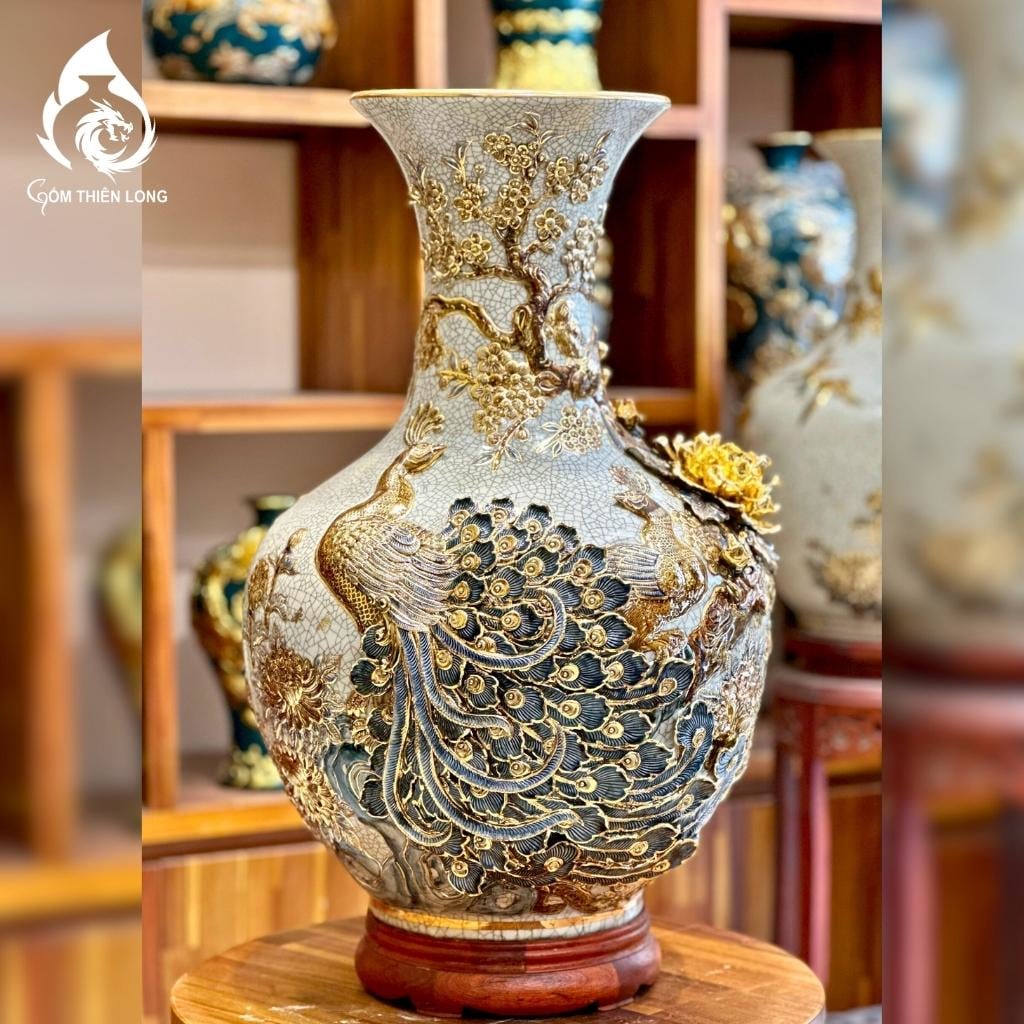Họa tiết trên bình củ tỏi được người nghệ nhân đắp nổi bằng tay vô cùng tinh xảo, phải mất nhiều ngày mới có thể hoàn thiện được. Khi ngắm thành phẩm gia chủ có thể thấy được độ tỉ mỉ từng gân lá, cánh hoa hay đuôi chim công được đắp nổi mềm mại trên thân bình.
