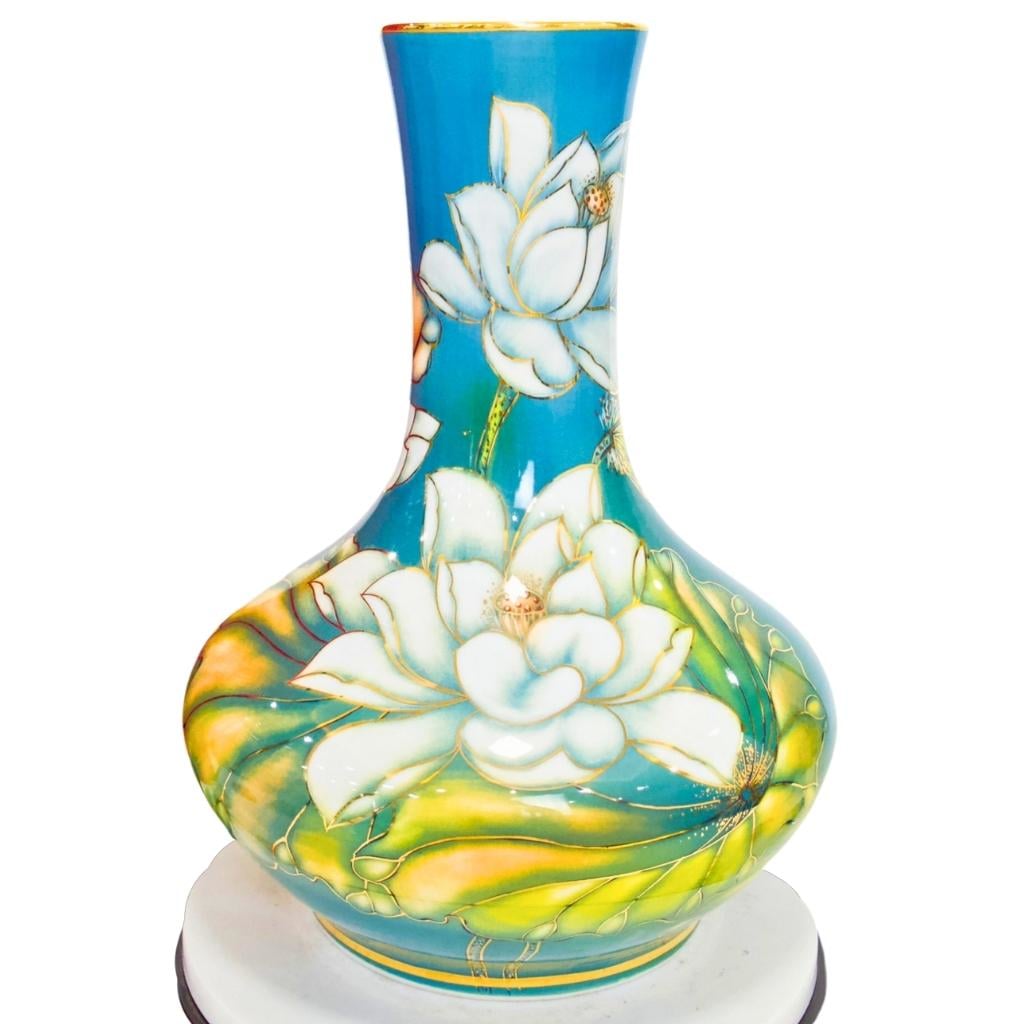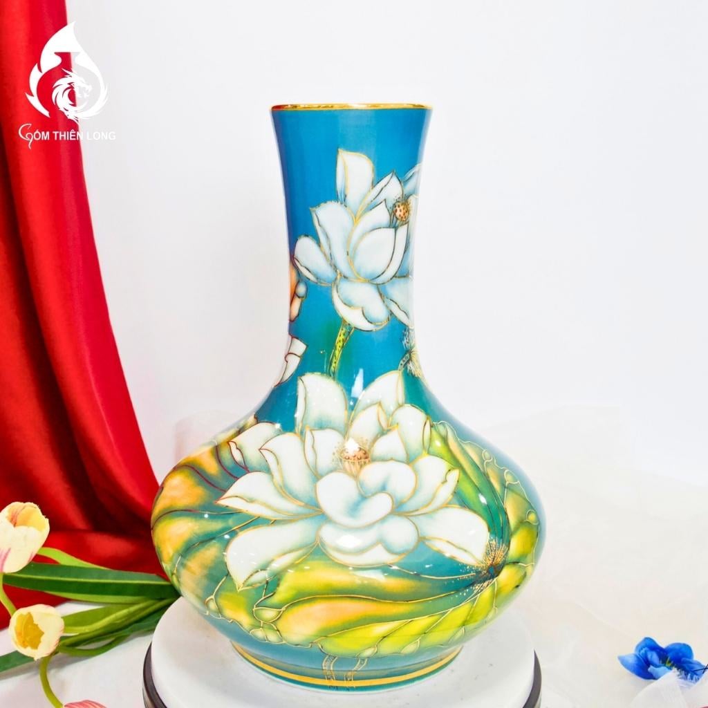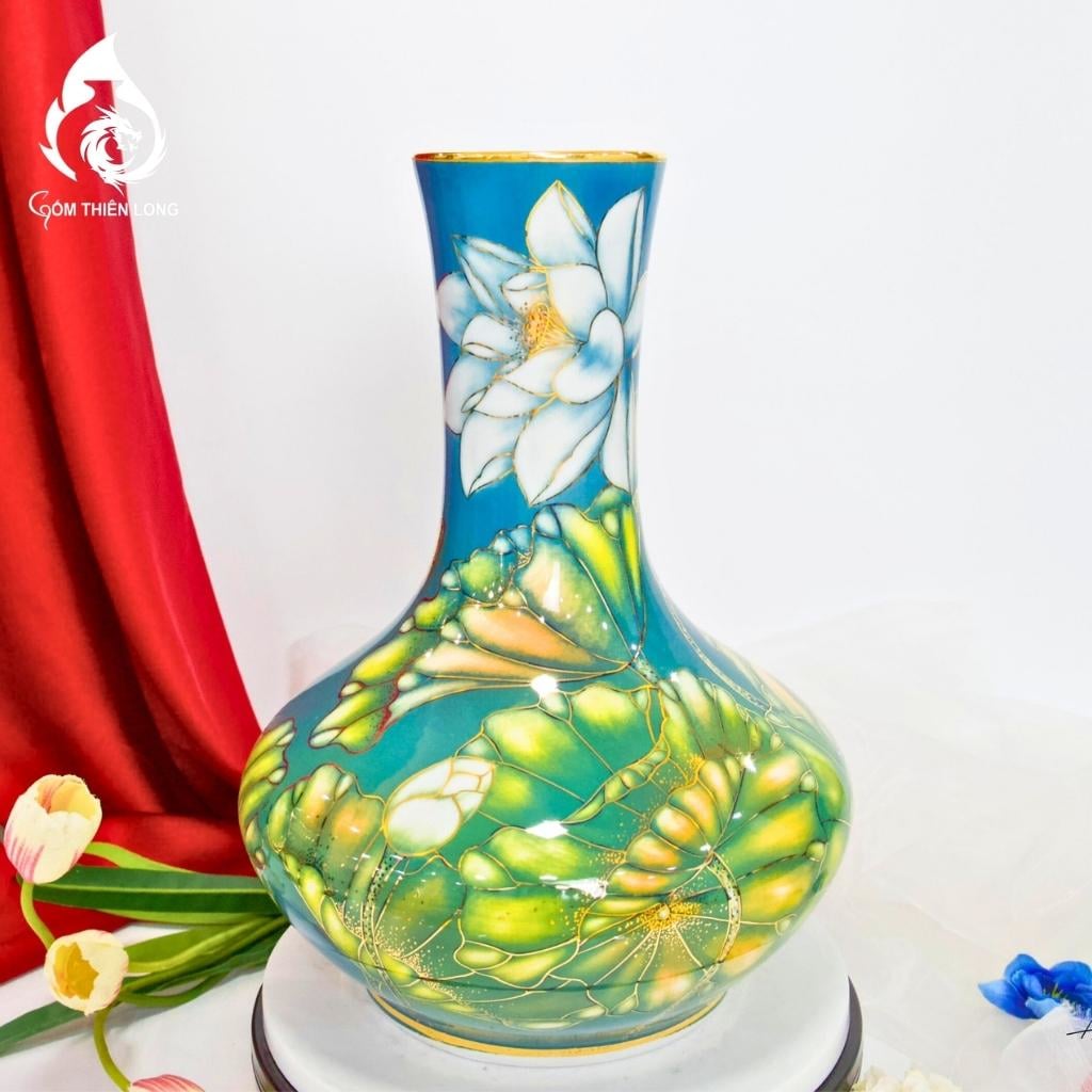 Bình củ tỏi Bát Tràng vẽ vàng hoa sen có ý nghĩa phong thủy rất tốt. Hình tượng hoa sen mang ý nghĩa của sự thanh cao, thuần khiết, vượt lên trên bùn lầy. Vàng kim tượng trưng cho sự giàu sang, phú quý. Vì vậy, bình củ tỏi Bát Tràng vẽ vàng hoa sen được coi là biểu tượng của sự may mắn, tài lộc, và bình an.