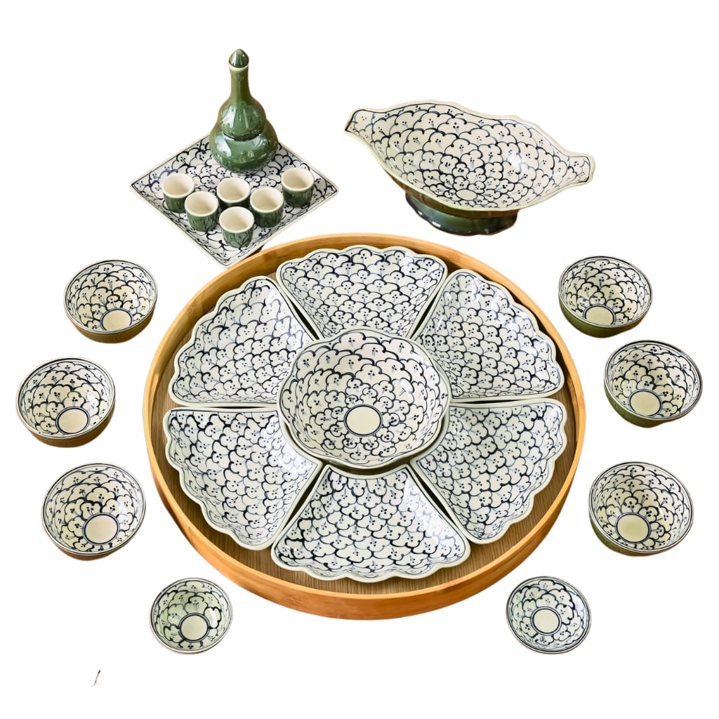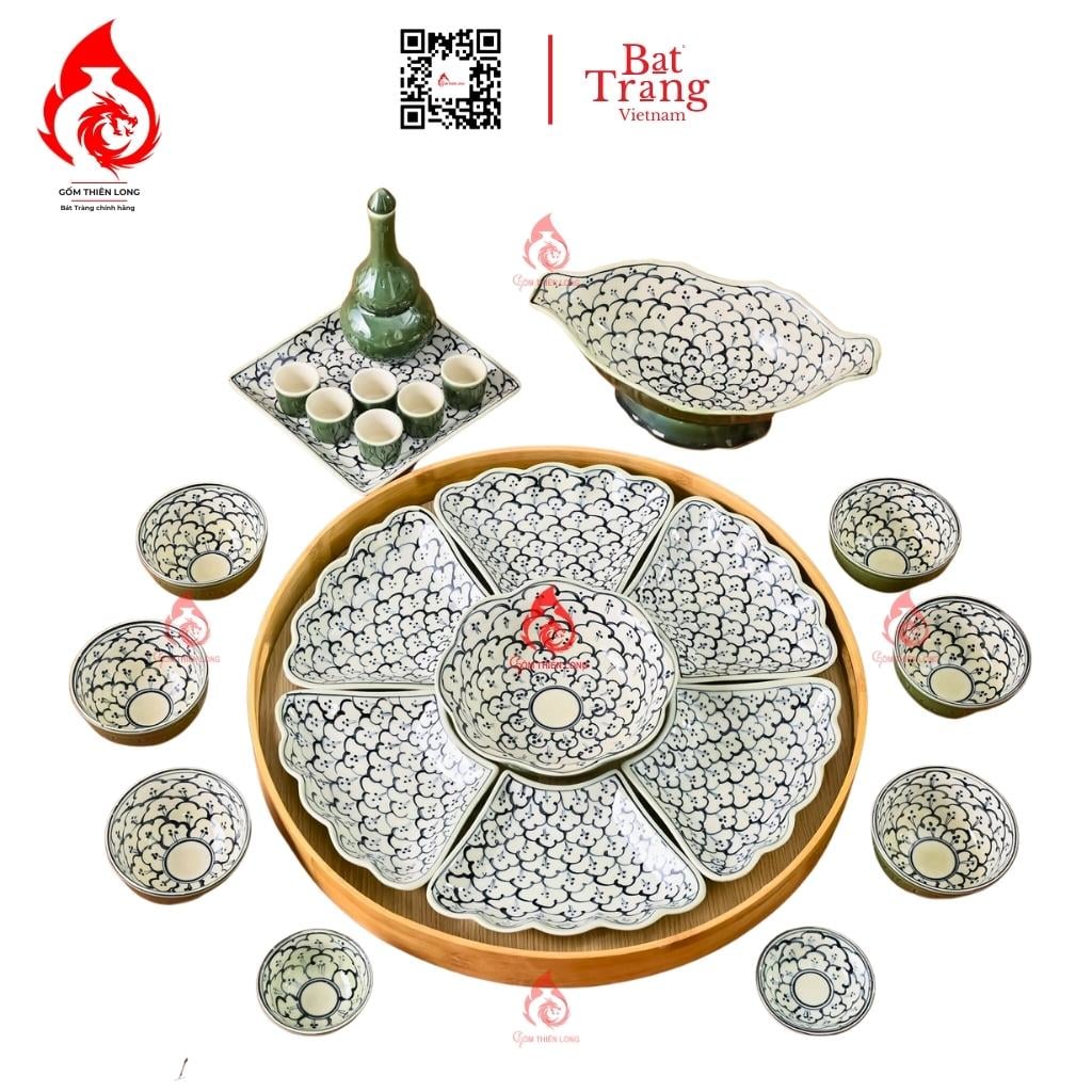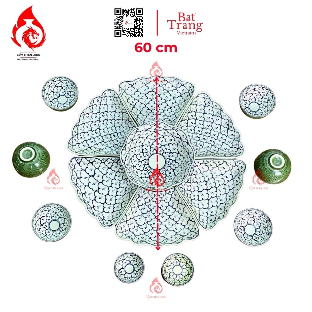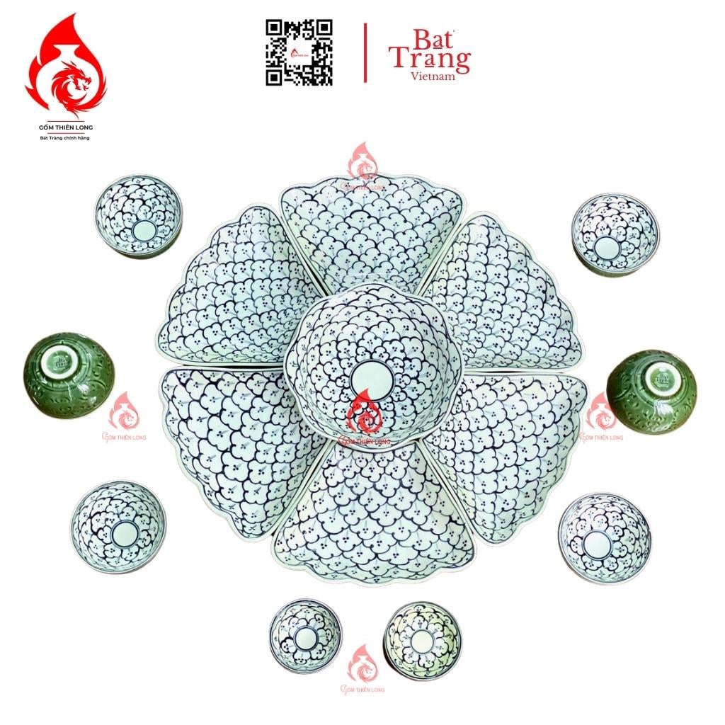 Bộ cơ bản: 15 món ( 1 bát tô, 6 bát con, 2 mắm muối, 6 đĩa cánh hoa).