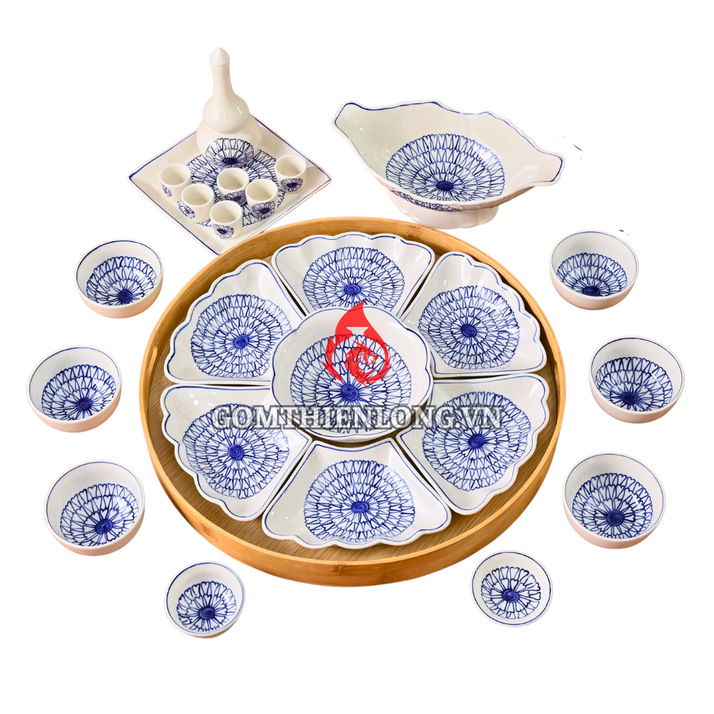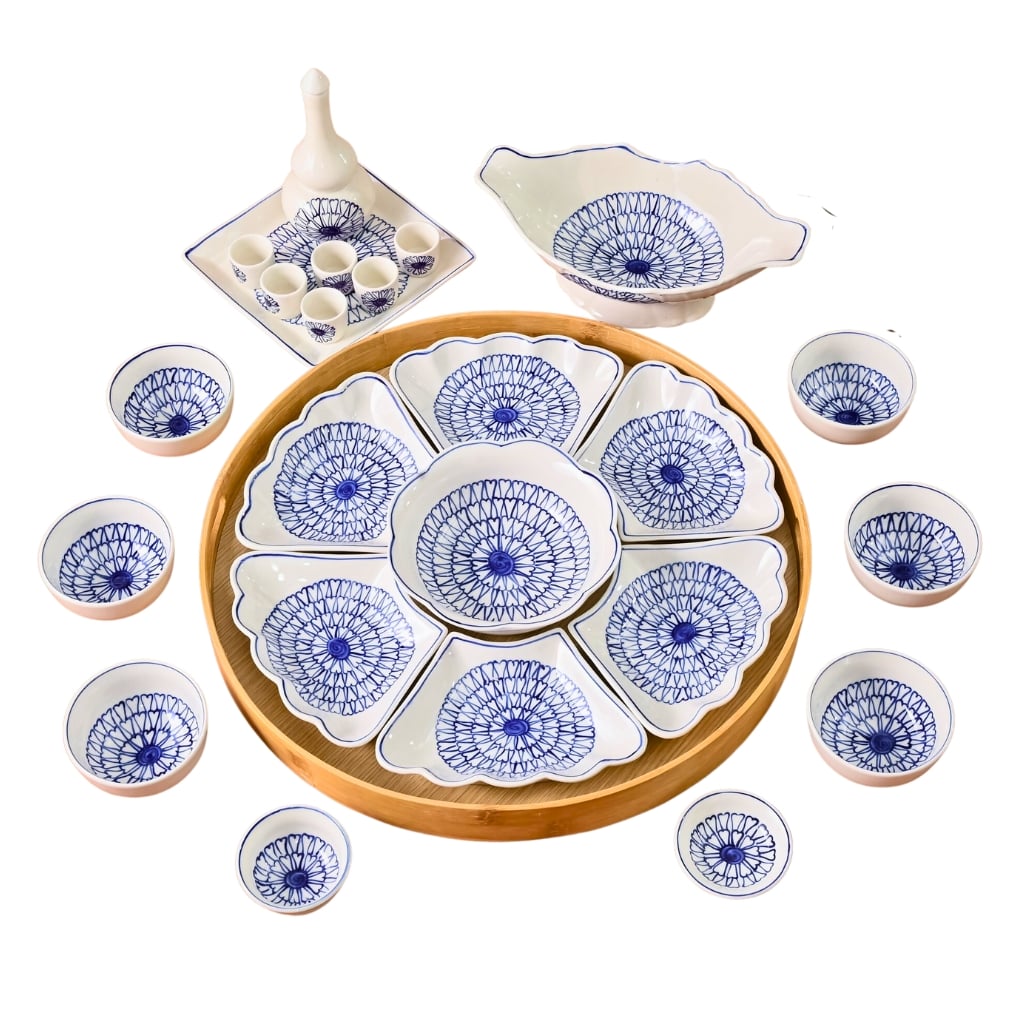 Bộ Cơ Bản: 1 bát tô – 6 đĩa cánh hoa – 6 bát cơm – 2 mắm muối (15 món ).