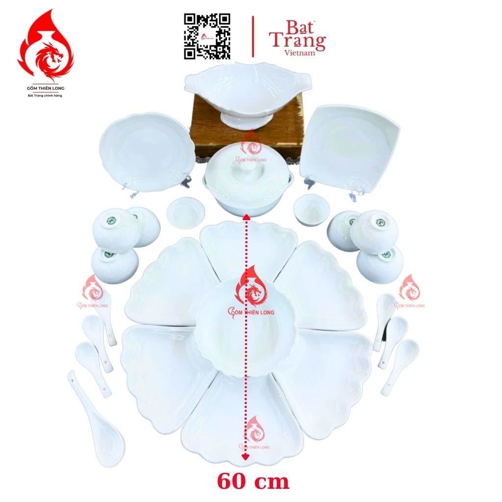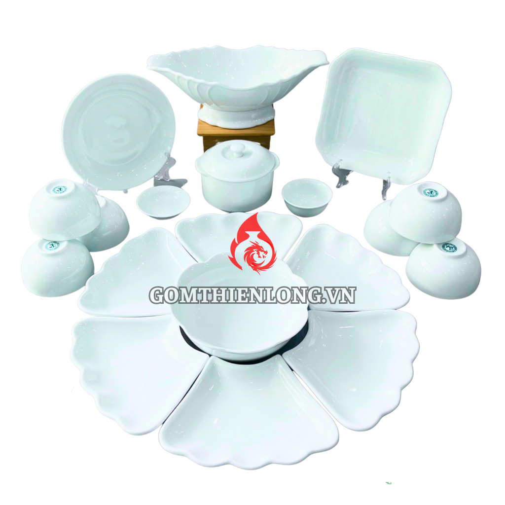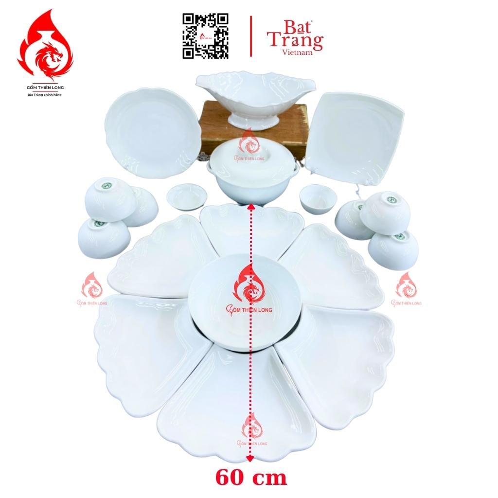 SP bao gồm: Bộ Cơ Bản: 1 bát tô - 6 đĩa cánh hoa - 6 bát cơm - 2 mắm muối (15 món ) Bộ Đầy Đủ: Bộ Cơ Bản + các phụ kiện như bát gà, âu cơm, muôi, thìa hoặc bộ trà, bộ nậm, đĩa... ( LƯU Ý: Sản phẩm chưa bao gồm khay gỗ )