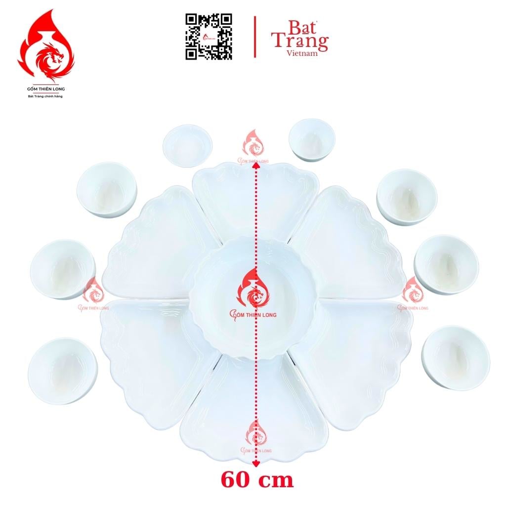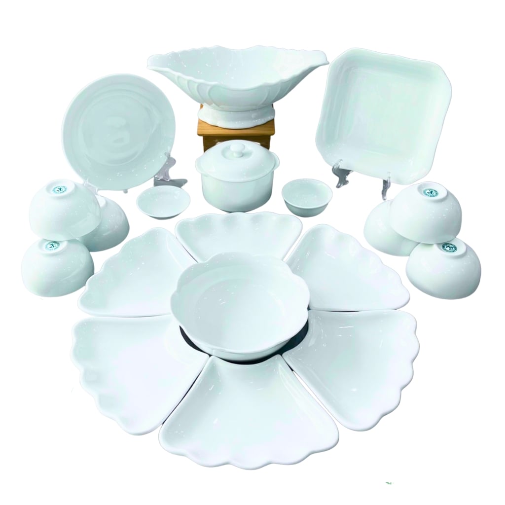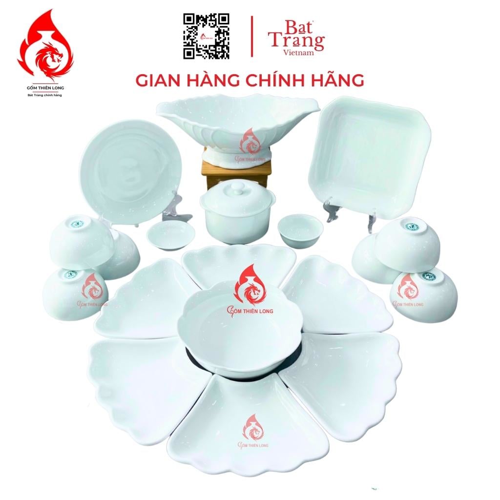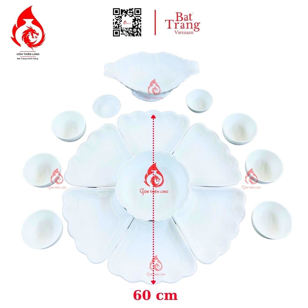 SP bao gồm: Bộ Cơ Bản: 1 bát tô - 6 đĩa cánh hoa - 6 bát cơm - 2 mắm muối (15 món ) Bộ Đầy Đủ: Bộ Cơ Bản + các phụ kiện như bát gà, âu cơm, muôi, thìa hoặc bộ trà, bộ nậm, đĩa... ( LƯU Ý: Sản phẩm chưa bao gồm khay gỗ )
