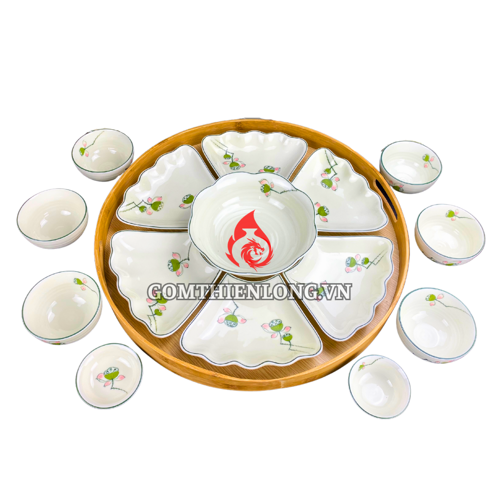 Bộ bát đĩa hoa mặt trời men kem vẽ đài sen sản xuất thủ công bảo hành 05 năm