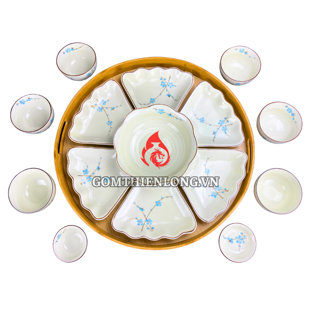 Bộ bát đĩa hoa mặt trời men kem vẽ đào xanh gốm cao cấp, nâng tầm giá trị