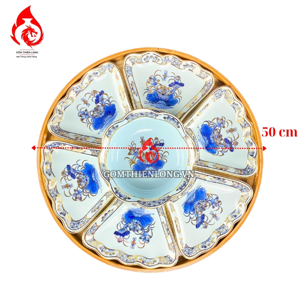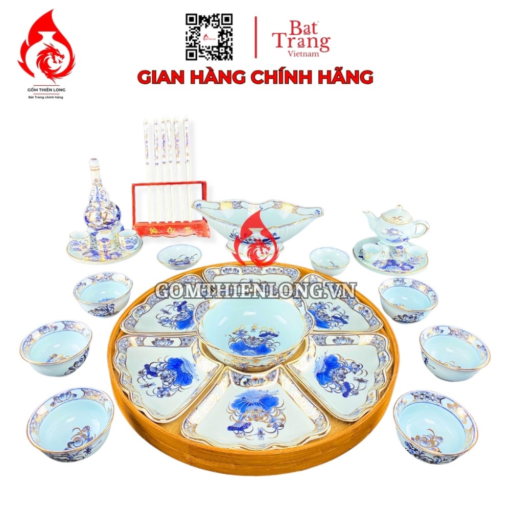 SP bao gồm: Bộ Cơ Bản: 1 bát tô - 6 đĩa cánh hoa - 6 bát cơm - 2 mắm muối (15 món ) Bộ Đầy Đủ: Bộ Cơ Bản + các phụ kiện như bát gà hoặc bộ trà, bộ nậm, bộ đũa... ( LƯU Ý: Sản phẩm chưa bao gồm khay gỗ )