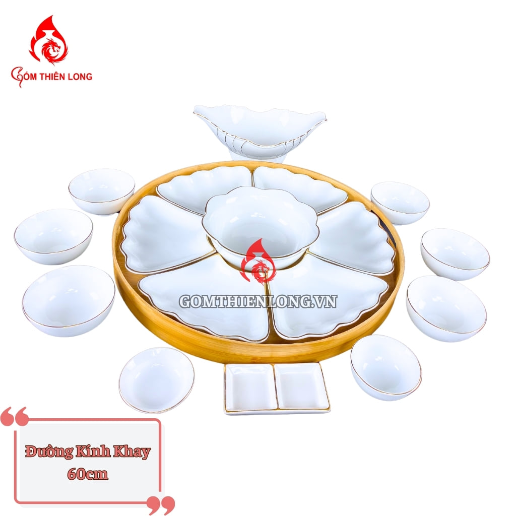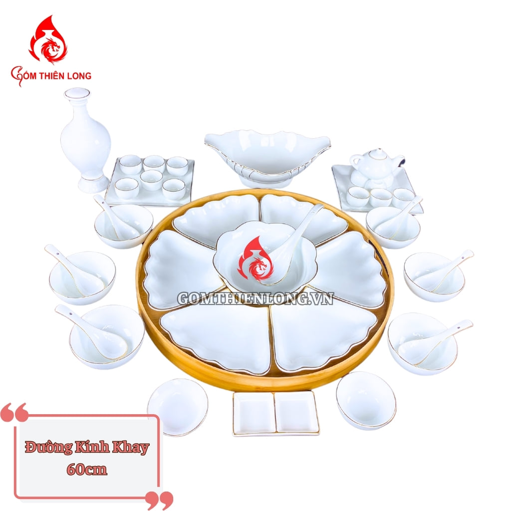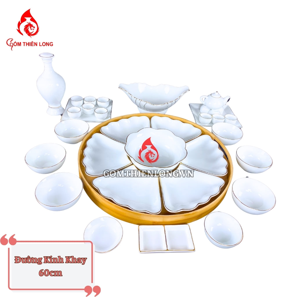 Bộ Cơ Bản: 1 tô hoa + 6 đĩa cánh hoa (7 SP) Bộ Đủ: 1 bát tô - 6 đĩa cánh hoa - 6 bát cơm - 3 mắm muối (16 SP ) Bộ Đầy Đủ: Bộ Đủ + các phụ kiện như bát gà hoặc bộ trà, bộ nậm, bộ đũa... ( LƯU Ý: Sản phẩm chưa bao gồm khay gỗ )