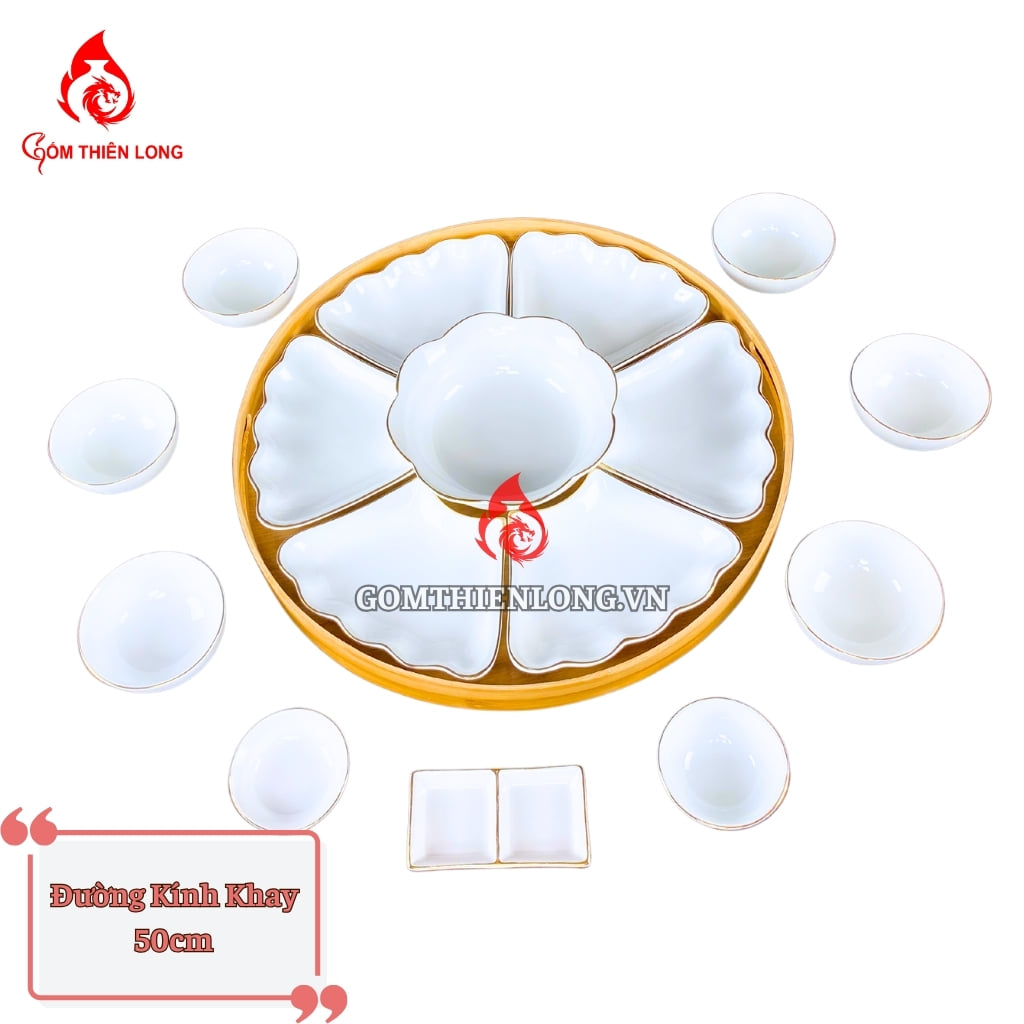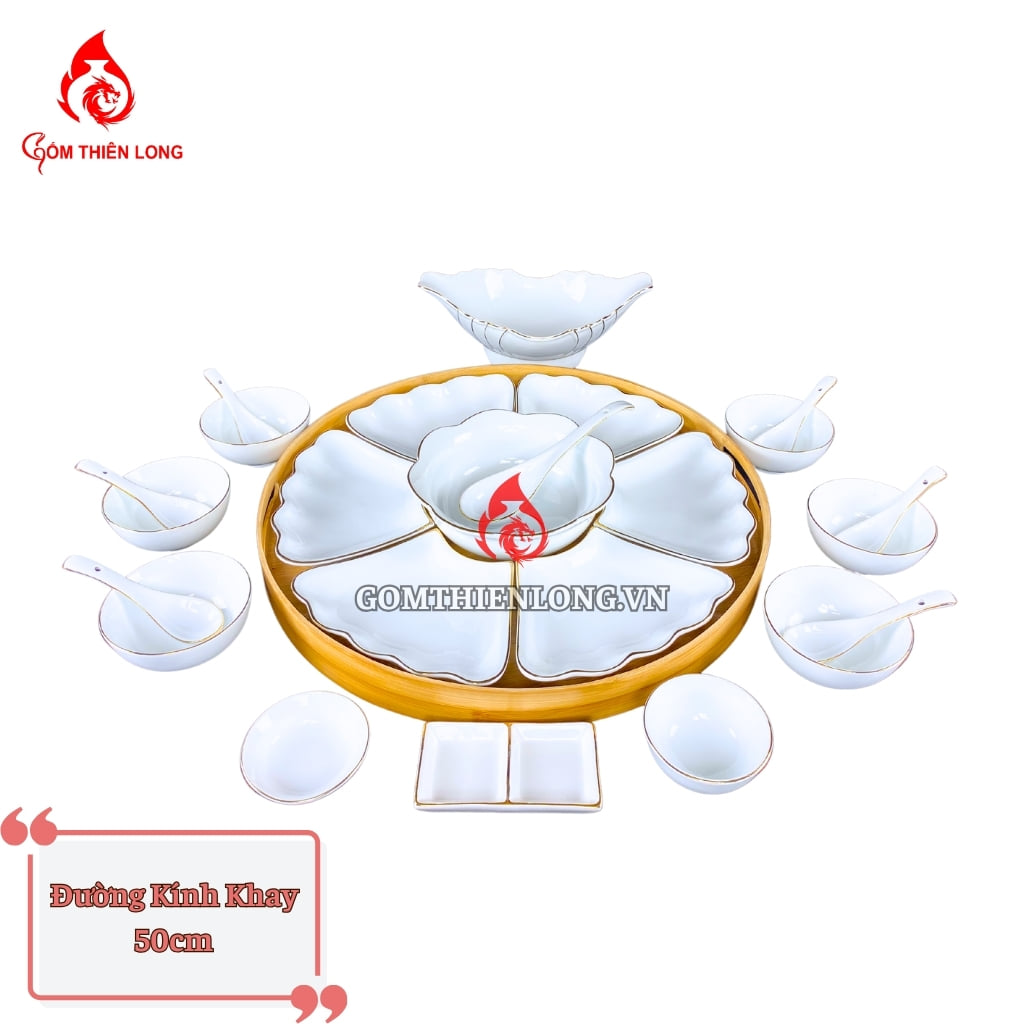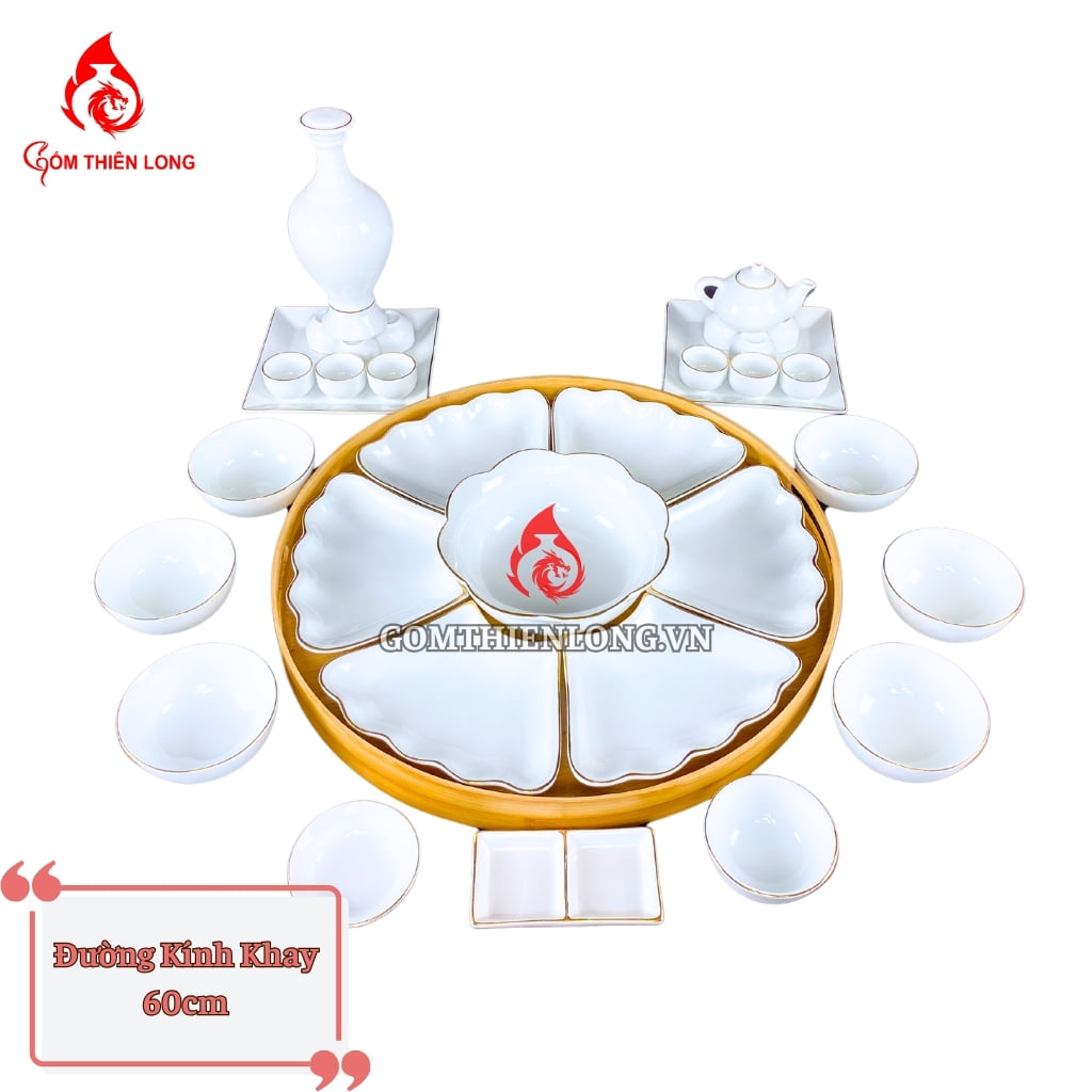 Bộ Cơ Bản: 1 tô hoa + 6 đĩa cánh hoa (7 SP) Bộ Đủ: 1 bát tô - 6 đĩa cánh hoa - 6 bát cơm - 3 mắm muối (16 SP ) Bộ Đầy Đủ: Bộ Đủ + các phụ kiện như bát gà hoặc bộ trà, bộ nậm, bộ đũa... ( LƯU Ý: Sản phẩm chưa bao gồm khay gỗ )