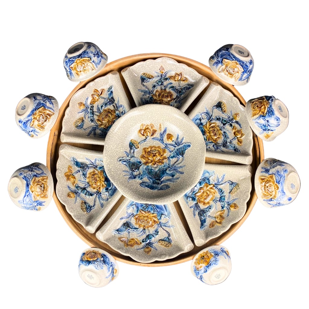 Giá trị phong thủy trên bộ bát đĩa hoa mặt trời men rạn cổ đắp nổi