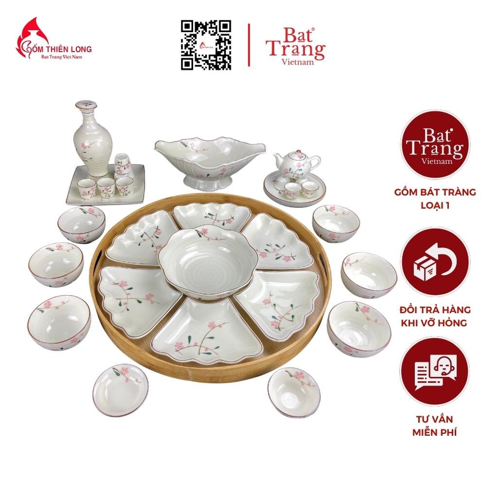 Bộ bát đĩa thắp hương men kem vẽ đào hồng gốm Bát Tràng cao cấp - bảo hành 05 năm