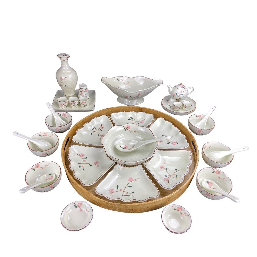 Bộ bát đĩa thắp hương men kem vẽ đào hồng