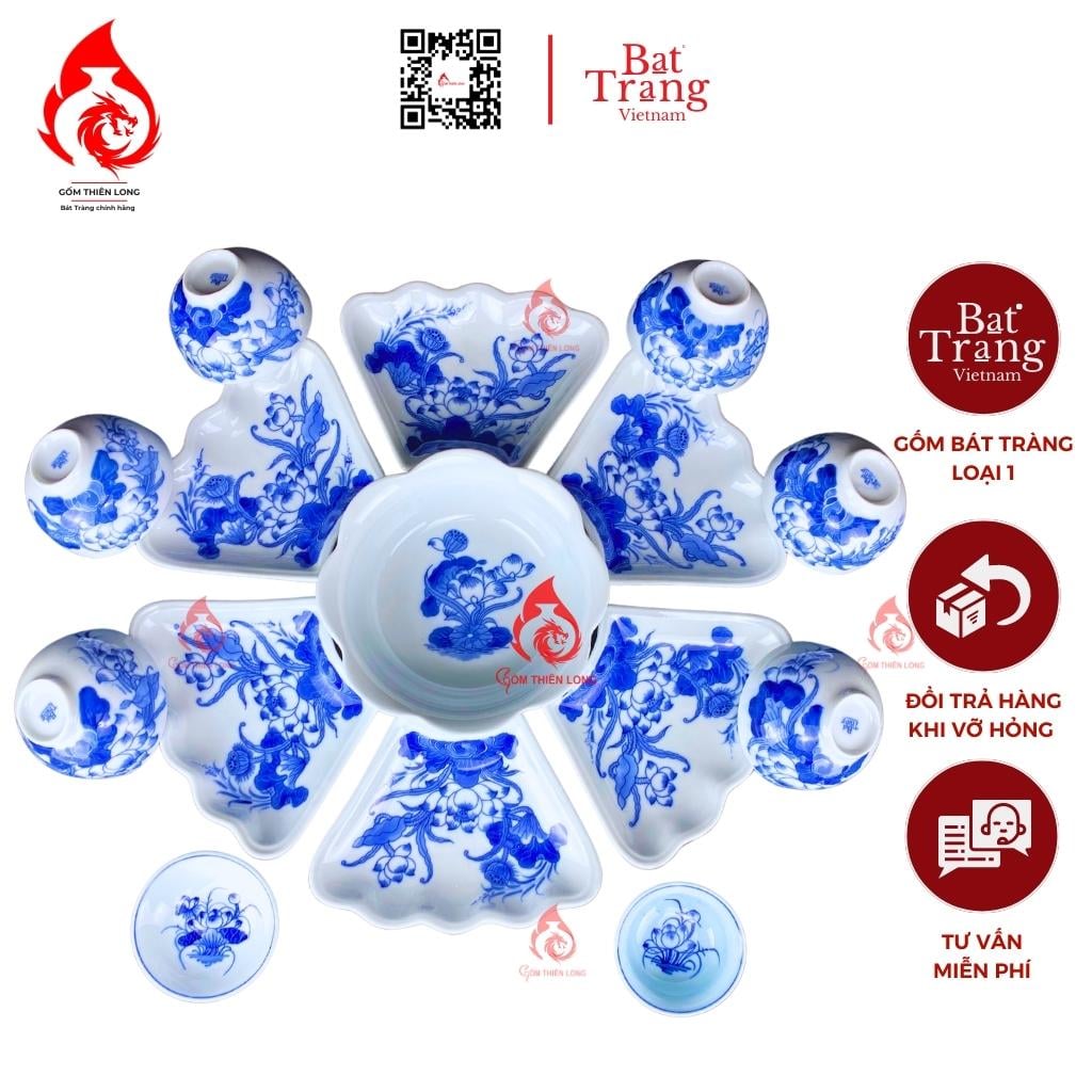 Bộ bát đĩa thắp hương men lam ngọc vẽ sen gốm Bát Tràng - giá sỉ chỉ hôm nay