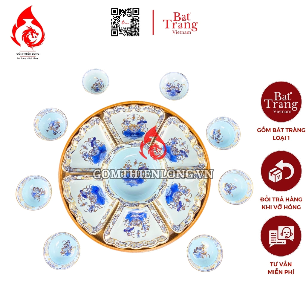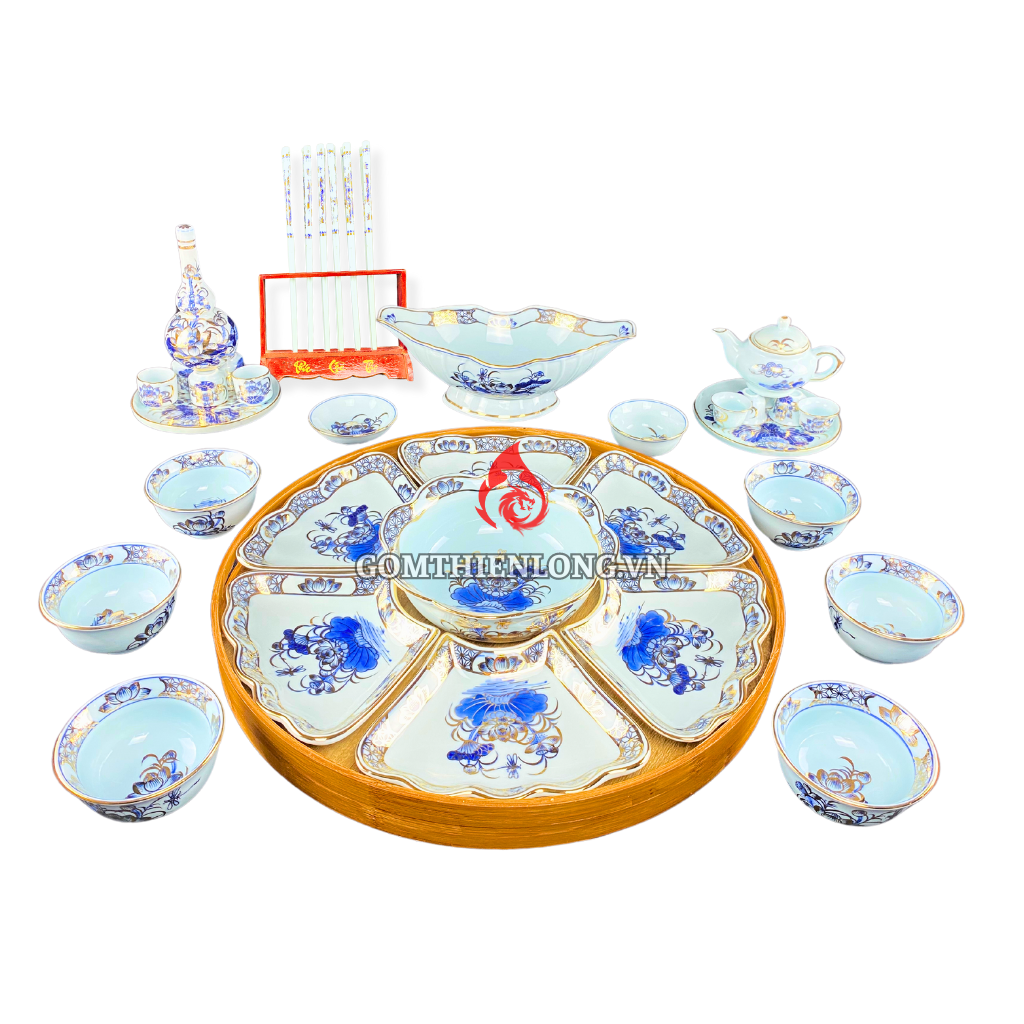 SP bao gồm: Bộ Cơ Bản: 1 bát tô - 6 đĩa cánh hoa - 6 bát cơm - 2 mắm muối (15 món ) Bộ Đầy Đủ: Bộ Cơ Bản + các phụ kiện như bát gà hoặc bộ trà, bộ nậm, bộ đũa... ( LƯU Ý: Sản phẩm chưa bao gồm khay gỗ )