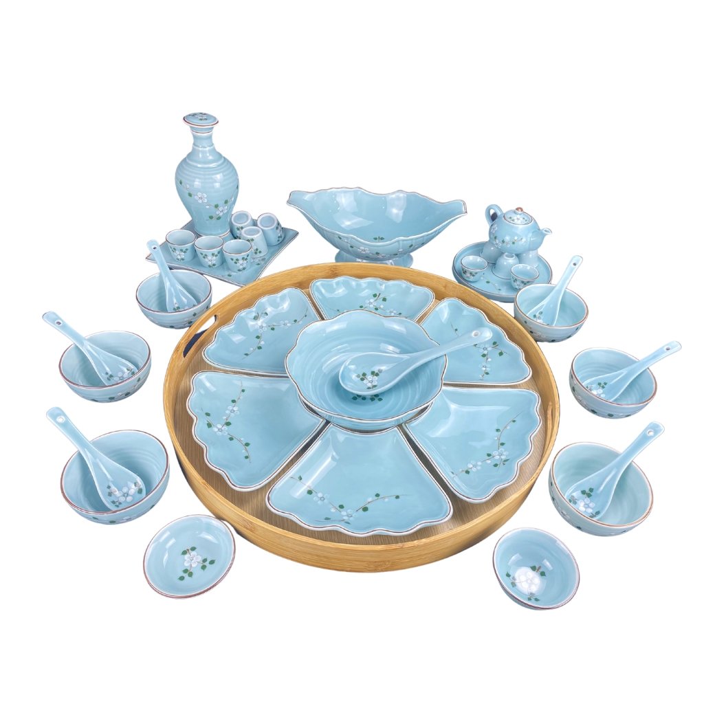 Tất cả đều được làm từ gốm sứ cao cấp và bên ngoài là lớp men xanh ngọc vô cùng sang trọng kết hợp với những nét vẽ đào trắng vô cùng nhẹ nhàng, tinh tế.