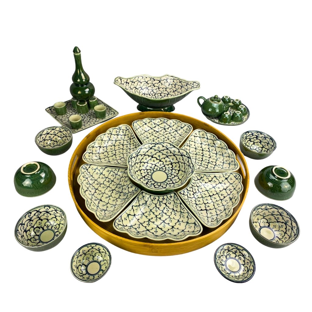 Bộ bát đĩa thắp hương xanh rêu vẽ bèo được chế tác từ những nguyên liệu quý từ những vùng đất thiêng của Tổ quốc. Đất sét cao lanh sau khi được khai thác sẽ qua xử lý nhằm loại bỏ hết những tạp chất sau đó mới hoà quyện cùng với mạch nước thiêng ở sông Hồng làm nên cốt gồm được các thần linh “bảo vệ và phụ trợ”.