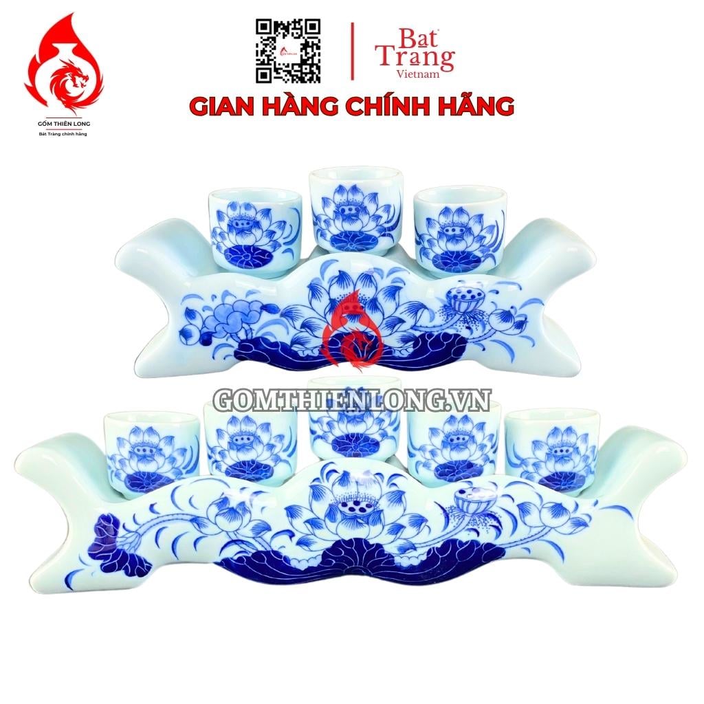 Bộ kỷ chén nước trên bàn thờ men lam ngọc vẽ hoa sen Bát Tràng là một sản phẩm đồ thờ cúng cao cấp, được sản xuất thủ công từ làng nghề gốm sứ Bát Tràng nổi tiếng. Bộ sản phẩm gồm 3 - 5 chén thờ đặt trên một đế kỷ được trang trí hình hoa sen, mang vẻ đẹp trang trọng, tinh tế và ý nghĩa tâm linh sâu sắc.