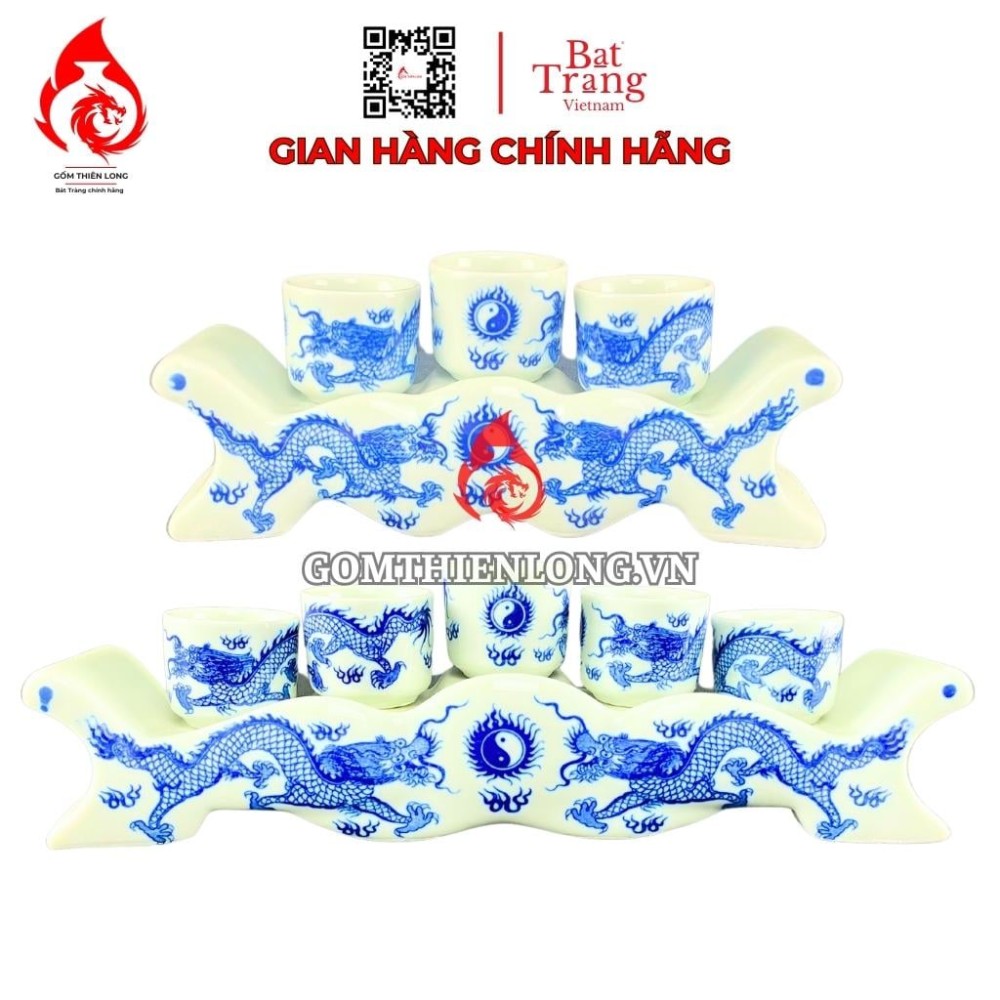 Bộ kỷ chén thờ men lam vẽ long chầu nguyệt Bát Tràng là một sản phẩm đồ thờ cúng cao cấp, được sản xuất thủ công từ làng nghề gốm sứ Bát Tràng nổi tiếng. Bộ sản phẩm gồm 3 - 5 chén thờ đặt trên một đế kỷ được trang trí hình long chầu nguyệt, mang vẻ đẹp trang trọng, tinh tế và ý nghĩa tâm linh sâu sắc.