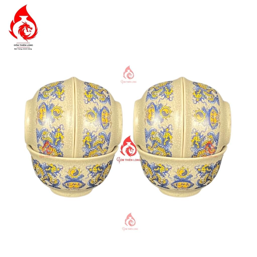 Bộ đồ thờ Bát Tràng men rạn in long chầu nguyệt là một trong những mẫu bộ đồ thờ Bát Tràng được ưa chuộng nhất hiện nay. Bộ đồ thờ này mang đậm phong cách truyền thống, với họa tiết rồng chầu nguyệt được in nổi tinh xảo, mang ý nghĩa phong thủy tốt lành, giá thành và chất lượng lại vô cùng đảm bảo phù hợp với nhu cầu sử dụng của gia chủ.
