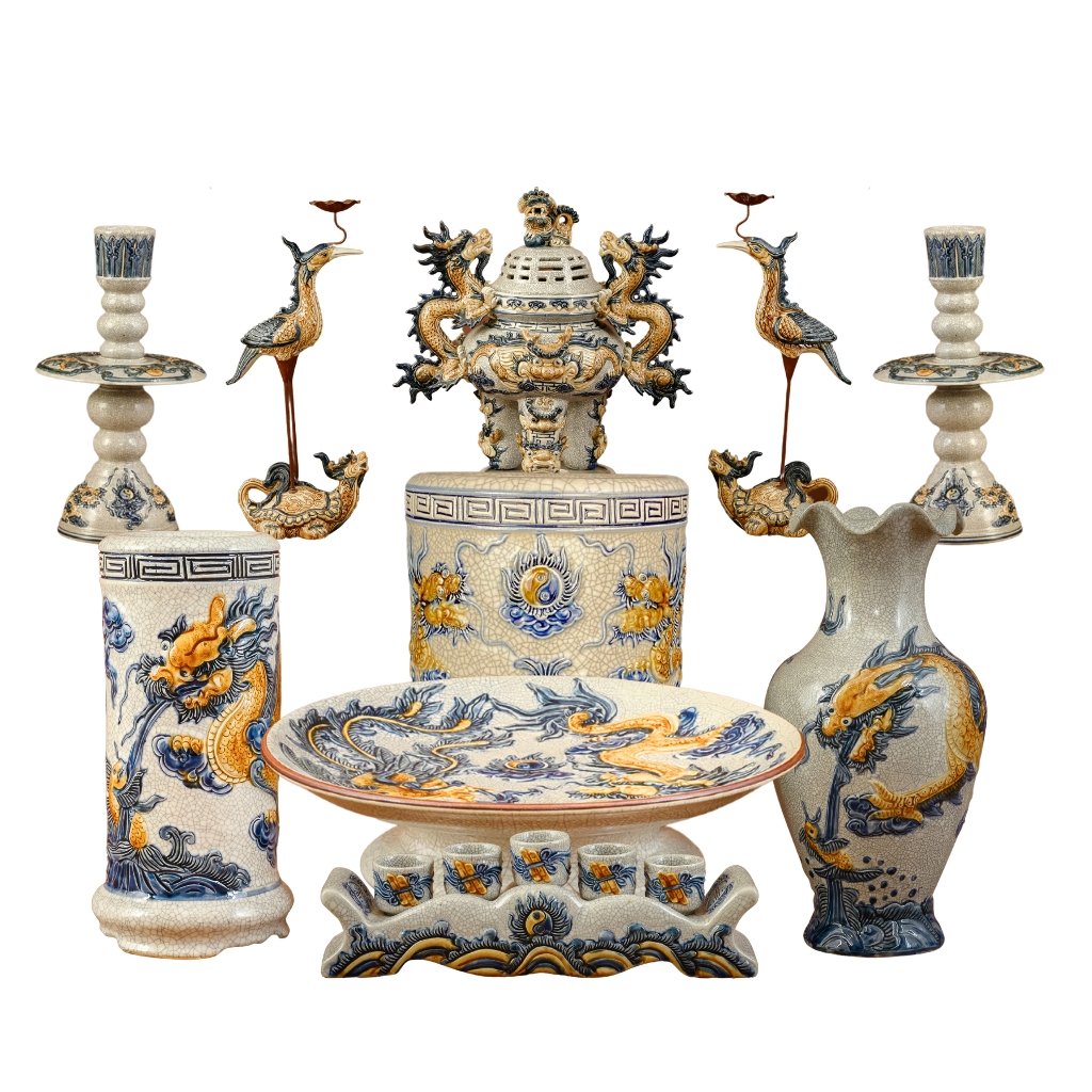 Bộ đồ thờ gia tiên men rạn đắp nổi