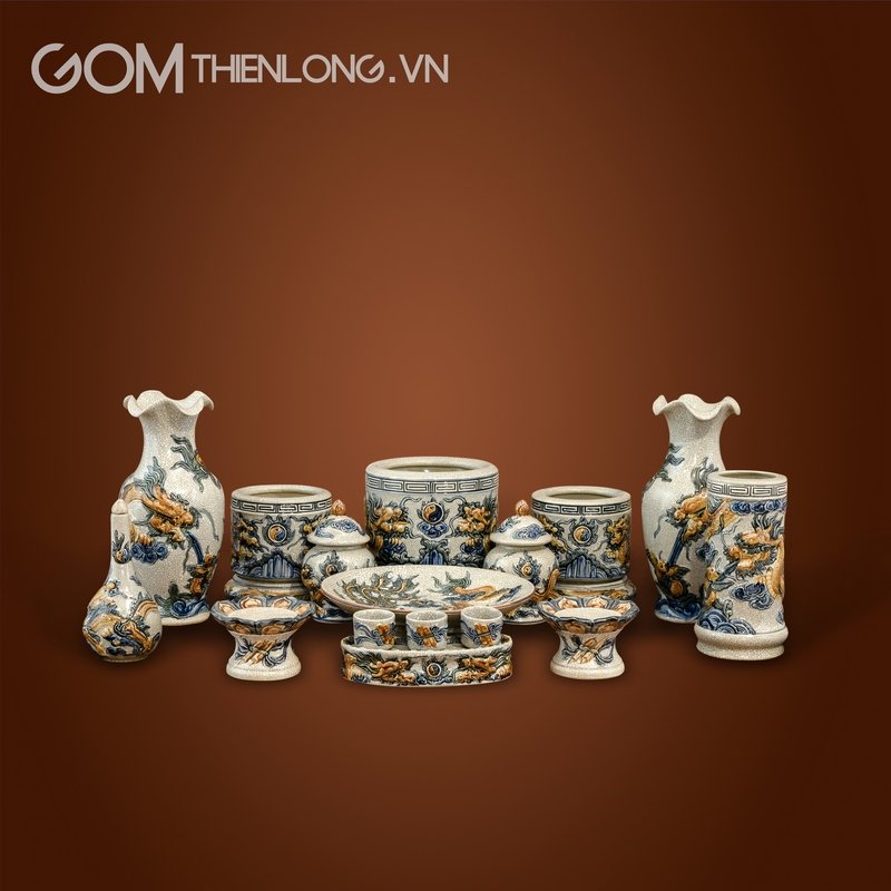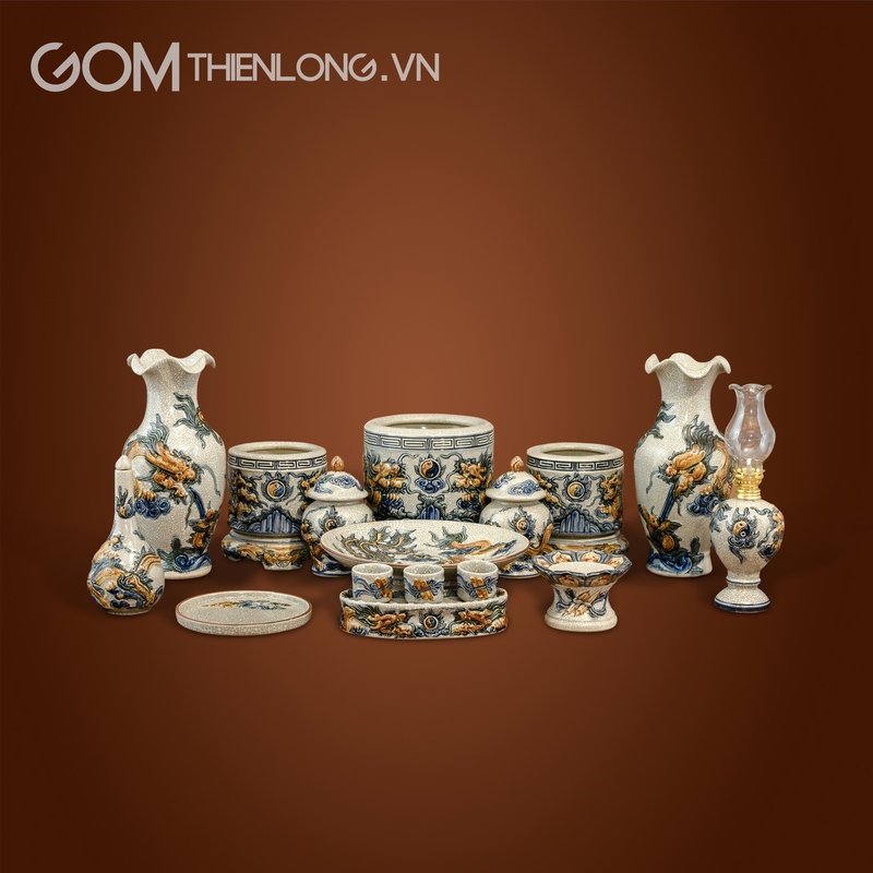 Bộ đồ thờ gia tiên men rạn đắp nổi gốm Bát Tràng giúp kết nối quá khứ và hiện tại, giá tốt, bảo hành 05 năm hiện có trên gian hàng shopee và website của gốm Thiên Long. Bộ đồ thờ men rạn đắp nổi không những giúp không gian bàn thờ thêm trang trọng, tôn kính, gọn gàng mà còn là sản phẩm giúp con cháu thể hiện tấm lòng thành kính với tổ tiên.