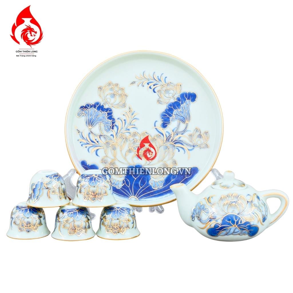 Bộ ấm chén bàn thờ men xanh lam vẽ vàng hoa sen Bát Tràng là một sản phẩm đồ thờ cúng cao cấp, tinh tế và sang trọng. Bộ sản phẩm bao gồm ấm trà, 3-5 chén trà và khay đĩa sứ, sử dụng pha trà dâng lên bàn thờ thần linh, gia tiên.