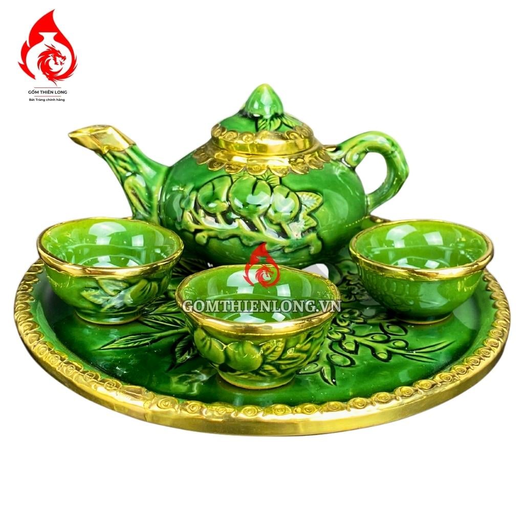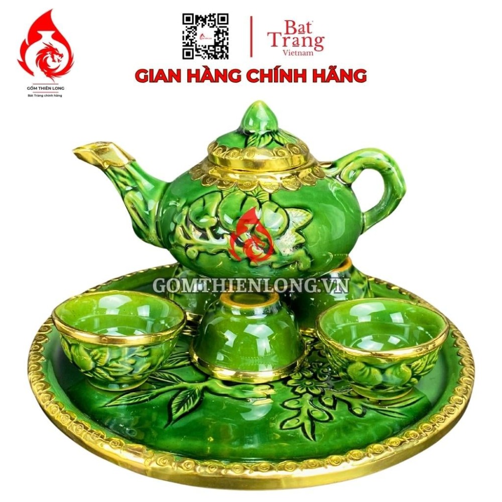 Nếu bạn đang tìm kiếm một bộ ấm chén bàn thờ cao cấp, sang trọng và ý nghĩa thì bộ ấm chén bàn thờ men men xanh ngọc lục bảo đắp nổi thọ đào Bát Tràng là một lựa chọn hoàn hảo.
