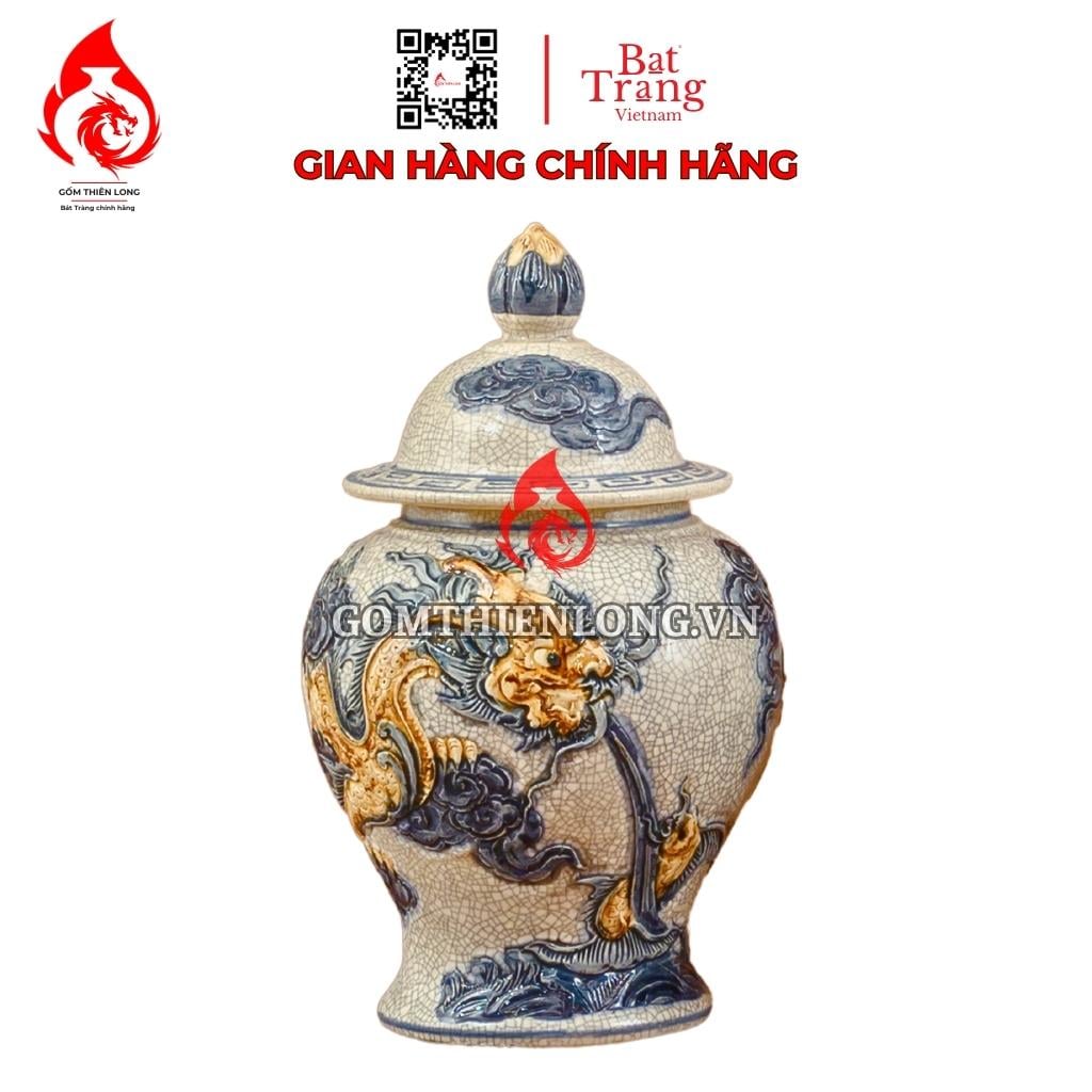 Mỗi đơn vị tại làng nghề gốm sứ Bát Tràng đều có những nét riêng trong sản phẩm của mình. Và gốm Bát Tràng Thiên Long cam kết mang tói sản phẩm Chóe thờ men rạn đắp nổi lưỡng long chầu nguyệt