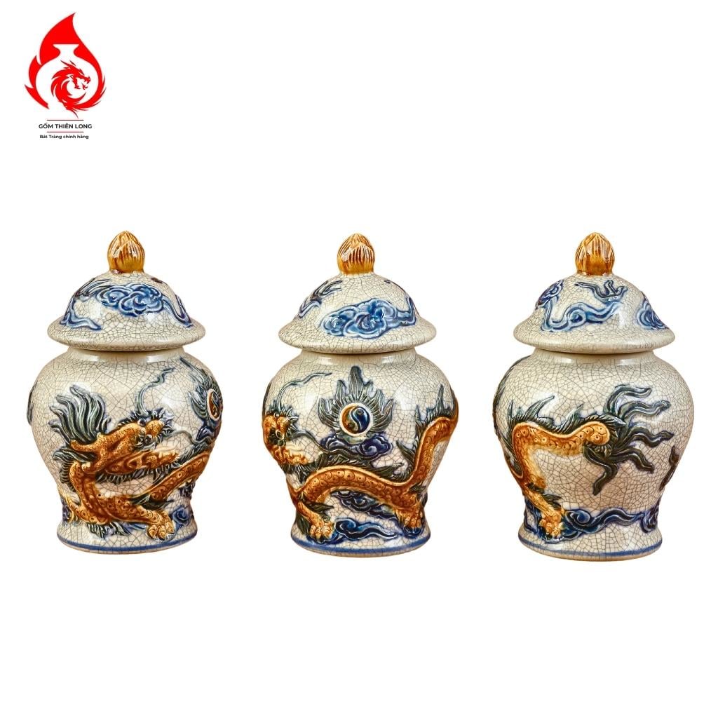 Chóe thờ men rạn đắp nổi lưỡng long chầu nguyệt Thiên Long - đẹp tinh tế - giá cạnh tranh