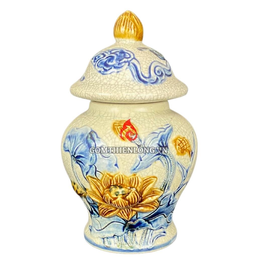 Chóe Thờ Bát Tràng Men Rạn Đắp Nổi Hoa Sen 230231S