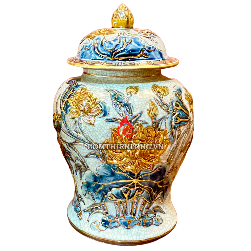 Chóe Thờ Bát Tràng Men Rạn Đắp Nổi Vẽ Vàng Hoa Sen 230232S