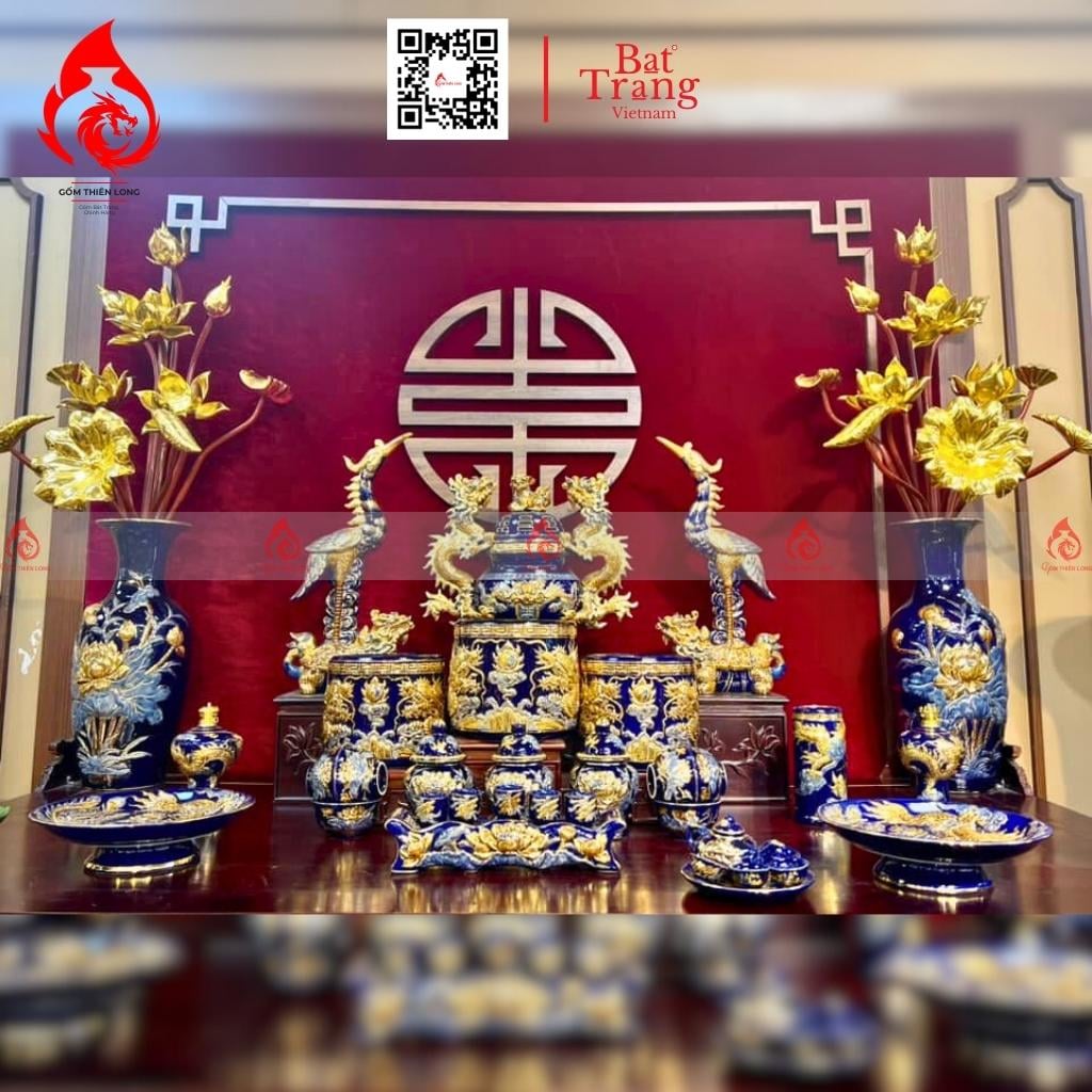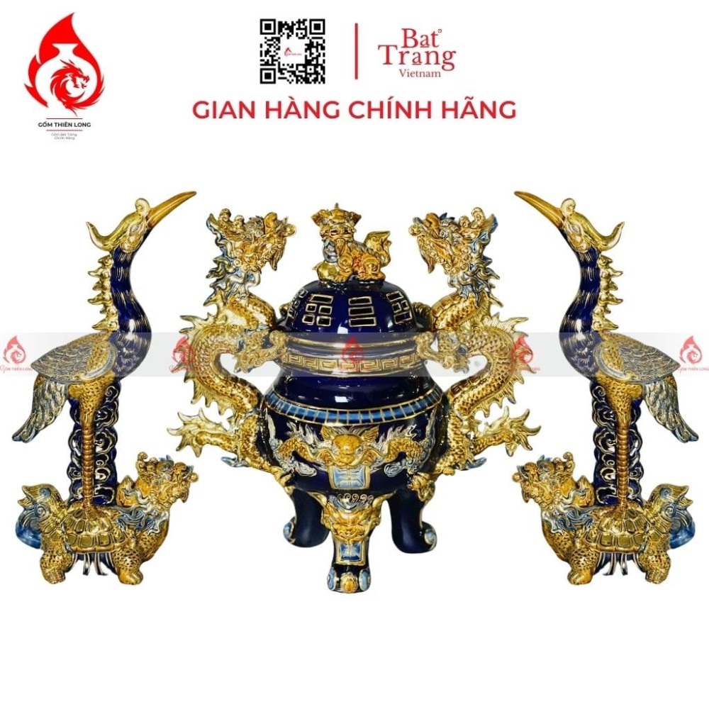 Bộ đỉnh hạc thờ bằng sứ men xanh coban vẽ vàng Bát Tràng có nhiều kích thước và mẫu mã khác nhau, phù hợp với nhiều không gian thờ cúng và kích thước ban thờ.