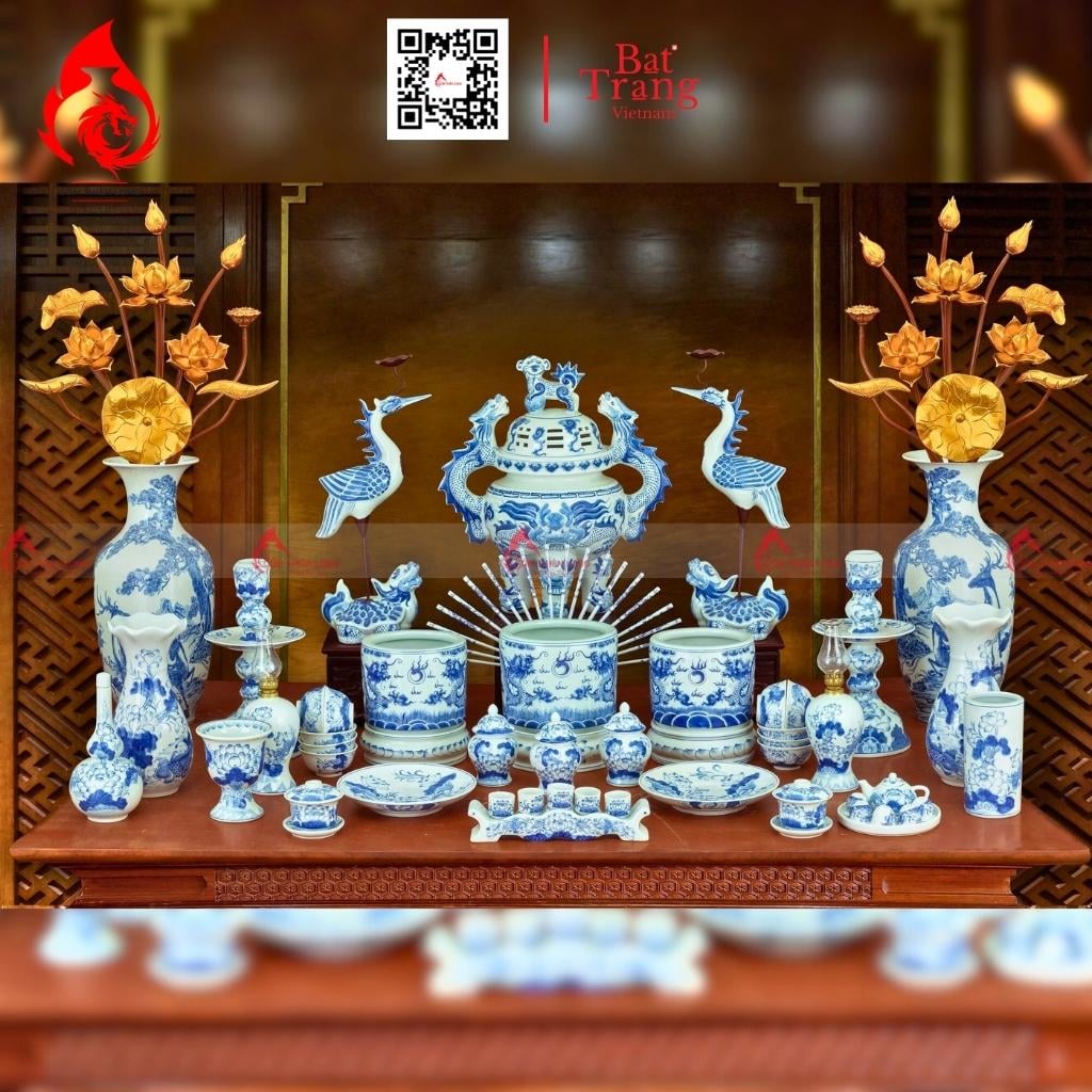 Bộ đỉnh hạc gốm sứ men lam Bát Tràng có nhiều kích thước và mẫu mã khác nhau, phù hợp với nhiều không gian thờ cúng và kích thước ban thờ.